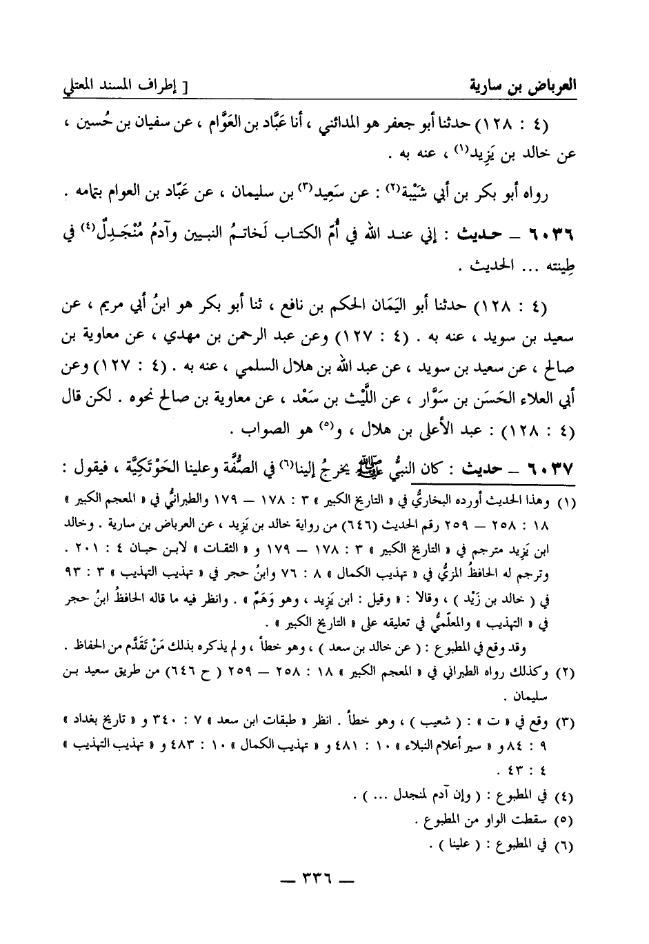 6036 - حديث إني عند الله في أم الكتاب لخاتم النبيين وآدم منجدل في طينته ... الحديث. (4: 128) حدثنا أبو اليمان الحكم بن نافع، ثنا أبو بكر هو ابن أبي مريم، عن سعيد بن سويد عنه به. (4: 127) وعن عبد الرحمن بن مهدي، عن معاوية بن صالح، عن سعيد بن سويد، عن عبد الله بن هلال السلمي عنه به. (4: 127) وعن أبي العلاء الحسن بن سوار، عن الليث بن سعد، عن معاوية بن صالح نحوه. لكن قال (4: 128) عبد الأعلى بن هلال وهو الصواب