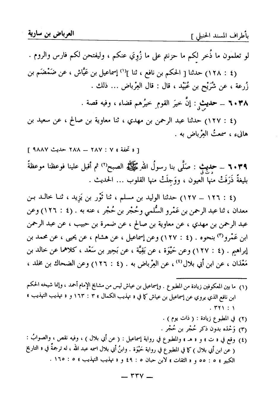 6039 -[د ت ق] حديث صلى بنا رسول الله صَلَّى اللَّهُ عَلَيْهِ وَسَلَّمَ ثم أقبل علينا فوعظنا موعظة بليغة ذرفت منها العيون ووجلت منها القلوب ... الحديث. (4: 126 - 127) حدثنا الوليد بن مسلم، ثنا ثور بن يزيد، ثنا خالد بن معدان، ثنا عبد الرحمن بن عمرو السلمي وحجر بن حجر عنه به. (4: 126) وعن عبد الرحمن بن مهدي، عن معاوية بن صالح، عن ضمرة بن حبيب، عن عبد الرحمن بن عمرو بنحوه (4: 127) وعن إسماعيل، عن هشام، عن يحيى، عن محمد بن إبراهيم (4: 127) وعن حيوة، عن بقية، عن بحير بن سعد، كلاهما عن خالد بن معدان، عن ابن أبي بلال، عن العرباض به (4: 126) وعن الضحاك بن مخلد، -[338]- عن ثور، عن خالد، عن عبد الرحمن بن عمرو وحده به