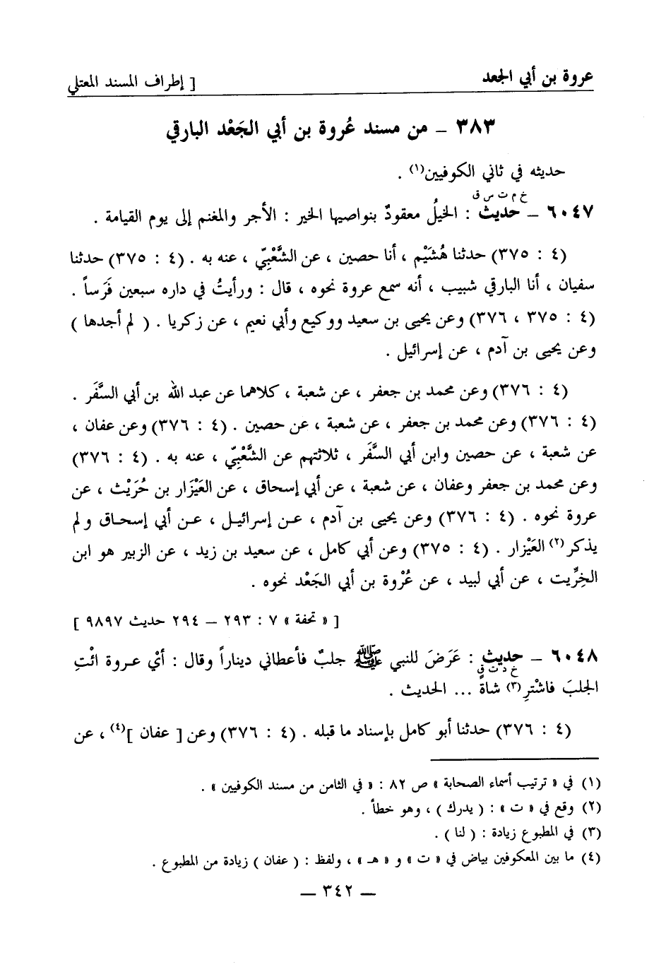 6047 -[خ م ت س ق] حديث الخيل معقود بنواصيها الخير الأجر والمغنم إلى يوم القيامة (4: 375) حدثنا هشيم أنا حصين، عن الشعبي عنه به. (4: 375) حدثنا سفيان، أنا البارقي شبيب أنه سمع عروة نحوه. قال ورأيت في داره سبعين فرسا (4: 375، 376) وعن يحيى بن سعيد ووكيع وأبي نعيم، عن زكريا (لم أجدها) وعن يحيى بن آدم، عن إسرائيل (4: 376) وعن محمد بن جعفر، عن شعبة، كلاهما عن عبد الله بن أبي السفر (4: 376) وعن محمد بن جعفر، عن شعبة، عن حصين (4: 376) وعن عفان، عن شعبة، عن حصين وابن أبي السفر ثلاثتهم، عن الشعبي عنه به. (4: 376) وعن محمد بن جعفر وعفان، عن شعبة، عن أبي إسحاق، عن العيزار بن حريث، عن عروة نحوه. (4: 376) وعن يحيى بن آدم، عن إسرائيل، عن أبي إسحاق ولم يذكر العيزار (4: 375) وعن أبي كامل، عن سعيد بن زيد، عن الزبير هو ابن الخريت، عن أبي لبيد، عن عروة بن أبي الجعد نحوه.