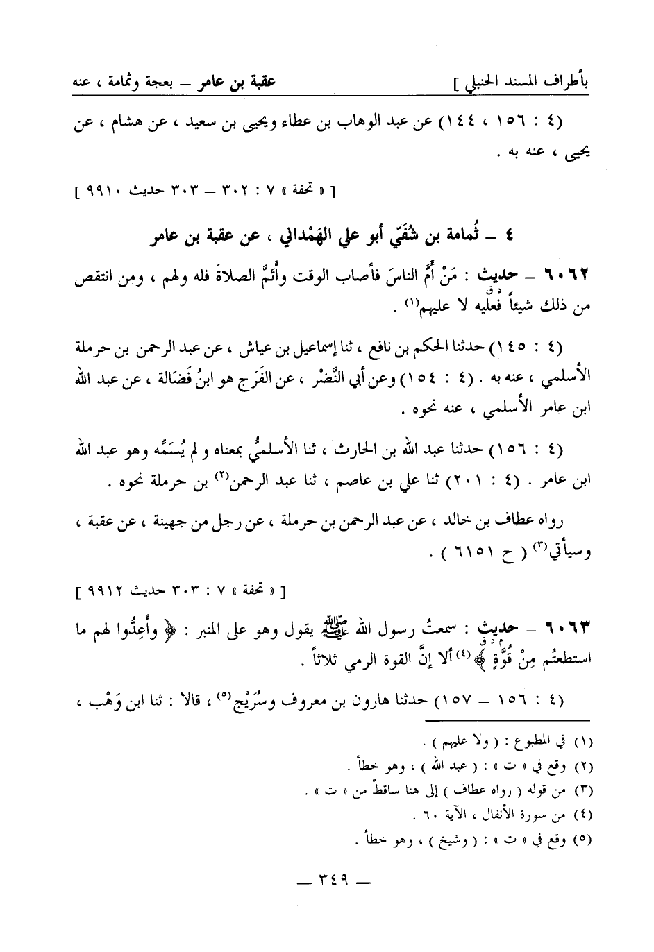 6062 -[د ق] حديث من أم الناس فأصاب الوقت وأتم الصلاة فله ولهم ومن انتقص من ذلك شيئا فعليه لا عليهم (4: 145) حدثنا الحكم بن نافع، ثنا إسماعيل بن عياش، عن عبد الرحمن بن حرملة الأسلمي عنه به. (4: 154) وعن أبي النضر، عن الفرج هو ابن فضالة، عن عبد الله بن عامر الأسلمي عنه نحوه. (4: 156) حدثنا عبد الله بن الحارث، ثنا الأسلمي بمعناه ولم يسمه وهو عبد الله بن عامر (4: 201) ثنا علي بن عاصم، ثنا عبد الرحمن بن حرملة نحوه. رواه عطاف بن خالد، عن عبد الرحمن بن حرملة، عن رجل من جهينة، عن عقبة وسيأتي (ح 6151)