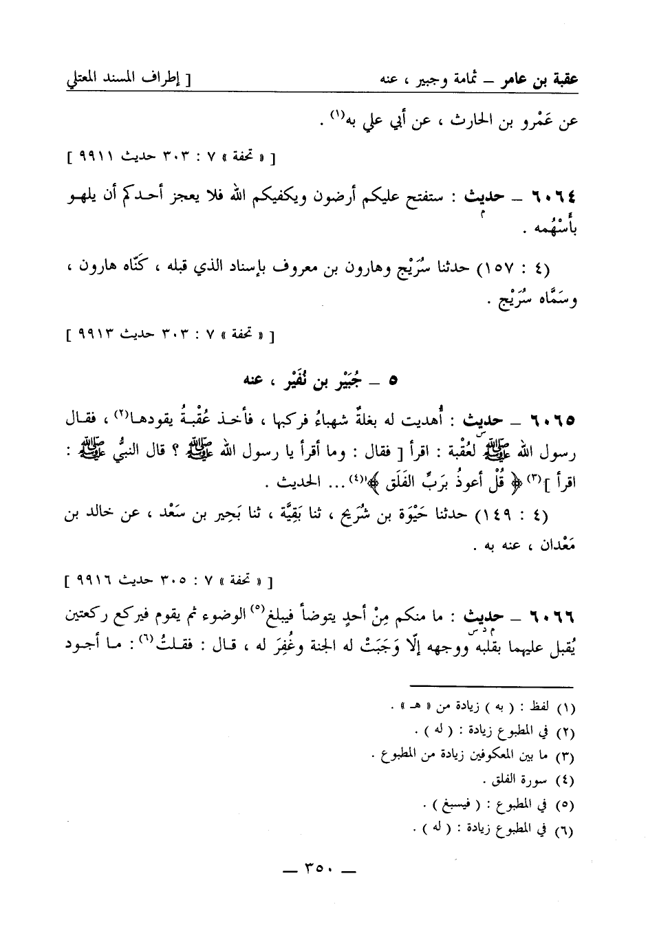 6065 -[س] حديث أهديت له بغلة شهباء فركبها فأخذ عقبة يقودها فقال رسول الله صَلَّى اللَّهُ عَلَيْهِ وَسَلَّمَ لعقبة اقرأ [فقال وما أقرأ يا رسول الله صَلَّى اللَّهُ عَلَيْهِ وَسَلَّمَ؟ قال النبي صَلَّى اللَّهُ عَلَيْهِ وَسَلَّمَ اقرأ] قل أعوذ برب الفلق ... الحديث. (4: 149) حدثنا حيوة بن شريح، ثنا بقية، ثنا بحير بن سعد، عن خالد بن معدان عنه به.