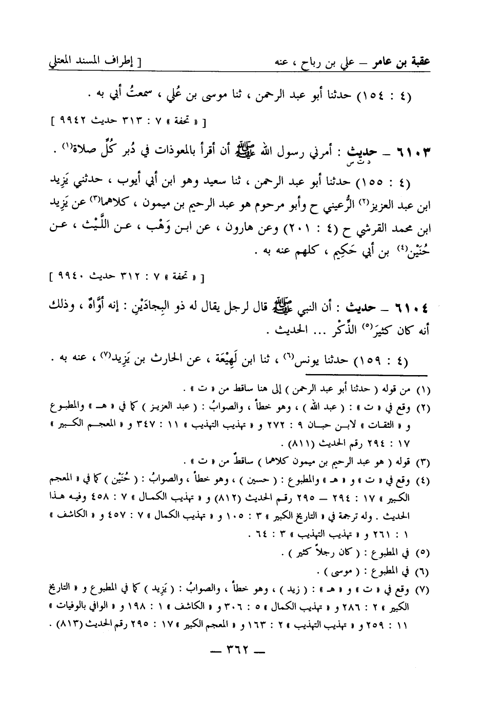 6103 -[د ت س] حديث: أمرني رسول الله صَلَّى اللَّهُ عَلَيْهِ وَسَلَّمَ أن أقرأ بالمعوذات في دبر كل صلاة (4: 155) حدثنا أبو عبد الرحمن، ثنا سعيد وهو ابن أبي أيوب، حدثني يزيد بن عبد العزيز الرعيني ح وأبو مرحوم هو عبد الرحم بن ميمون، كلاهما عن يزيد بن محمد القرشي ح (4: 201) وعن هارون، عن ابن وهب، عن الليث، عن حنين بن أبي حكيم كلهم عنه به.