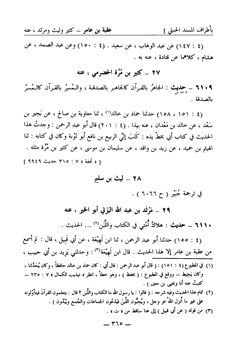 6110 - حديث: هلاك أمتي في الكتاب واللبن ... الحديث. (4: 155) حدثنا أبو عبد الرحمن، ثنا ابن لهيعة، عن أبي قبيل قال لم أسمع من عقبة بن عامر إلا هذا الحديث قال ابن لهيعة وحدثني يزيد بن أبي حبيب -[366]- عن أبي الخير بهذا