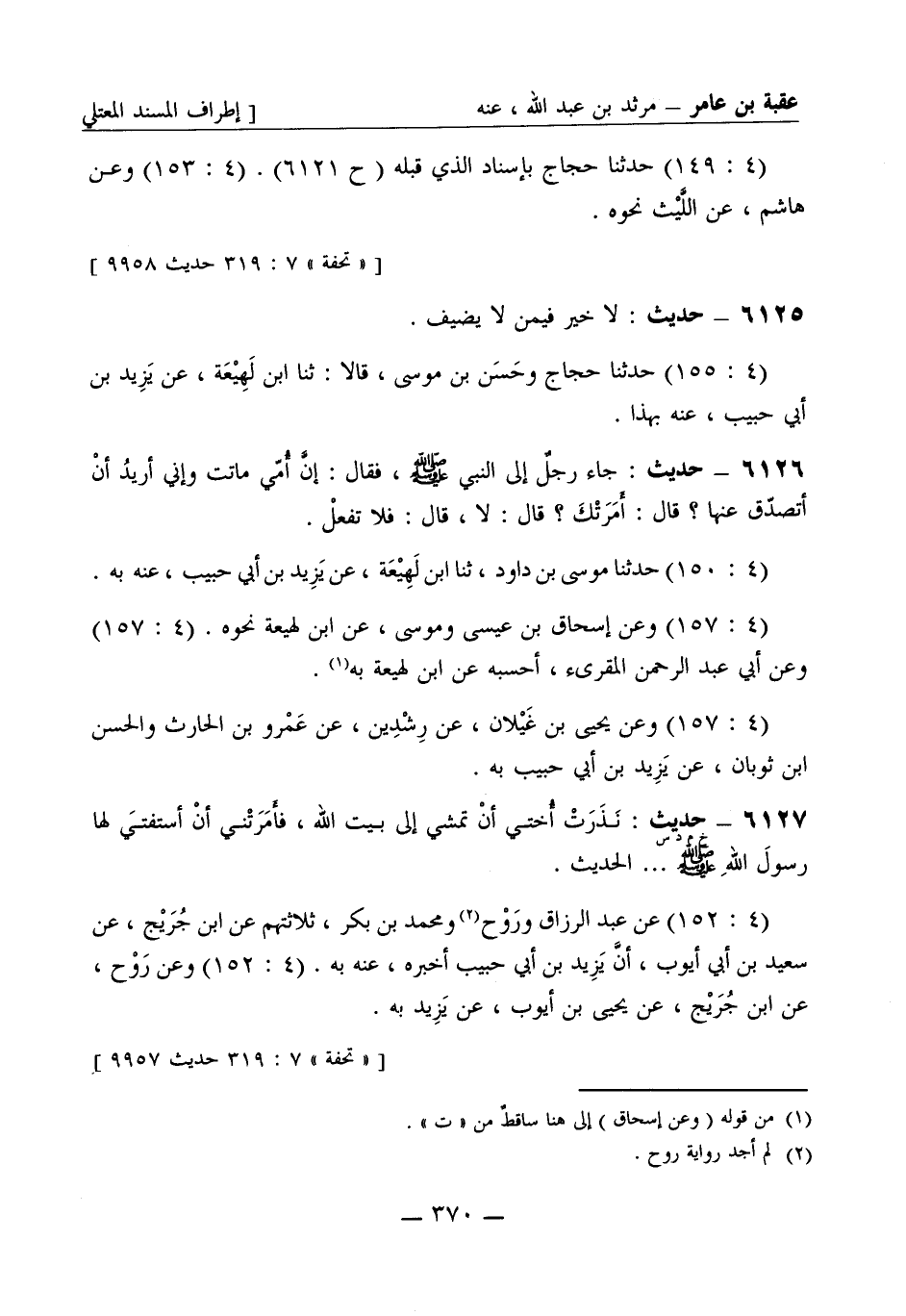 6126 - حديث جاء رجل إلى النبي صَلَّى اللَّهُ عَلَيْهِ وَسَلَّمَ فقال إن أمي ماتت وإني أريد أن أتصدق عنها قال أمرتك قال لا قال فلا تفعل (4: 150) حدثنا موسى بن داود، ثنا ابن لهيعة، عن يزيد بن أبي حبيب عنه به. (4: 157) وعن إسحاق بن عيسى وموسى، عن ابن لهيعة نحوه. (4: 157) وعن أبي عبد الرحمن المقرئ أحسبه، عن ابن لهيعة به (4: 157) وعن يحيى بن غيلان، عن رشدين، عن عمرو بن الحارث والحسن بن ثوبان، عن يزيد بن أبي حبيب به