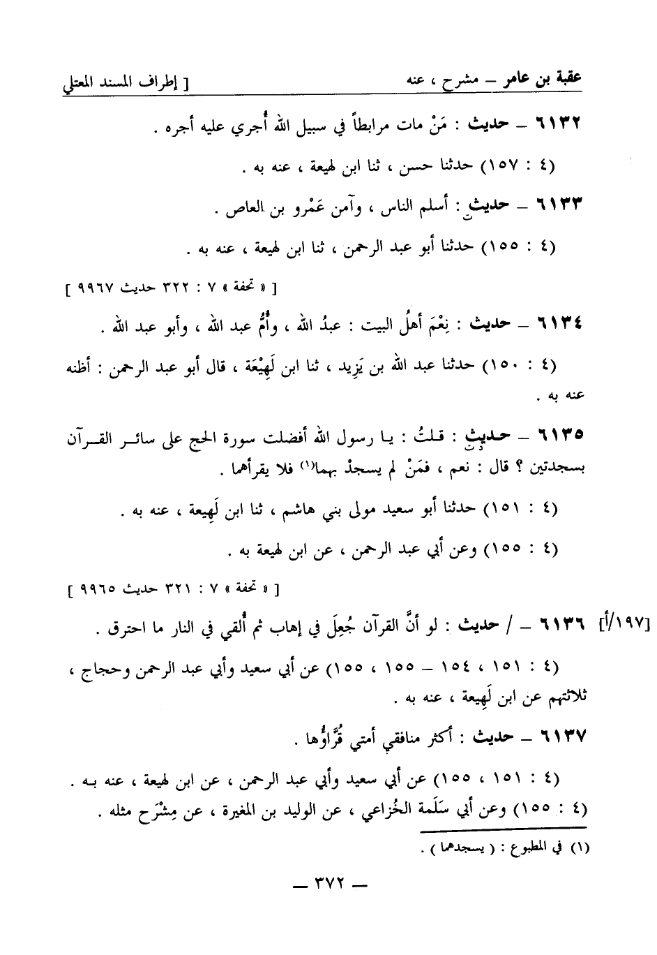 6137 - حديث أكثر منافقي أمتي قراؤها (4: 151، 155) عن أبي سعيد وأبي عبد الرحمن، عن ابن لهيعة عنه به. (4: 155) وعن أبي سلمة الخزاعي، عن الوليد بن المغيرة، عن مشرح مثله
