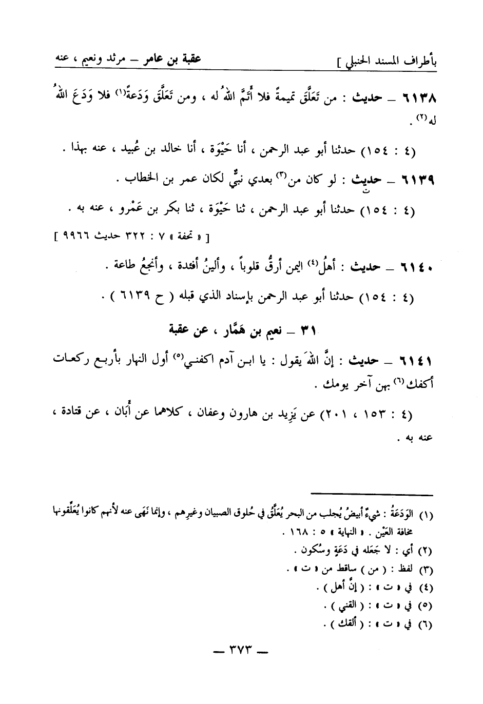 6138 - حديث: من تعلق تميمة فلا أتم الله له ومن تعلق ودعة فلا ودع الله له (4: 154) حدثنا أبو عبد الرحمن أنا حيوة أنا خالد بن عبيد، عنه بهذا.