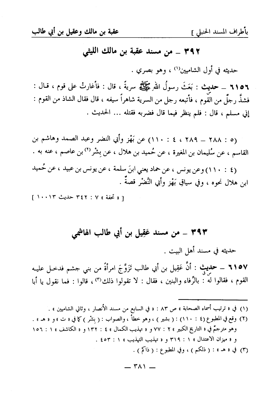 6156 -[س] حديث: بعث رسول الله صَلَّى اللَّهُ عَلَيْهِ وَسَلَّمَ سرية قال فأغارت على قوم قال فشذ رجل من القوم فأتبعه رجل من السرية شاهرا سيفه قال فقال الشاذ من القوم إني مسلم قال فلم ينظر فيما قال فضربه فقتله ... الحديث. (5: 288 - 289، 4: 110) عن بهز وأبي النضر وعبد الصمد وهاشم بن القاسم، عن سليمان بن المغيرة، عن حميد بن هلال، عن بشر بن عاصم عنه به. (4: 110) وعن يونس، عن حماد يعني ابن سلمة، عن يونس بن عبيد، عن حميد بن هلال نحوه. وفي سياق بهز وأبي النضر قصة