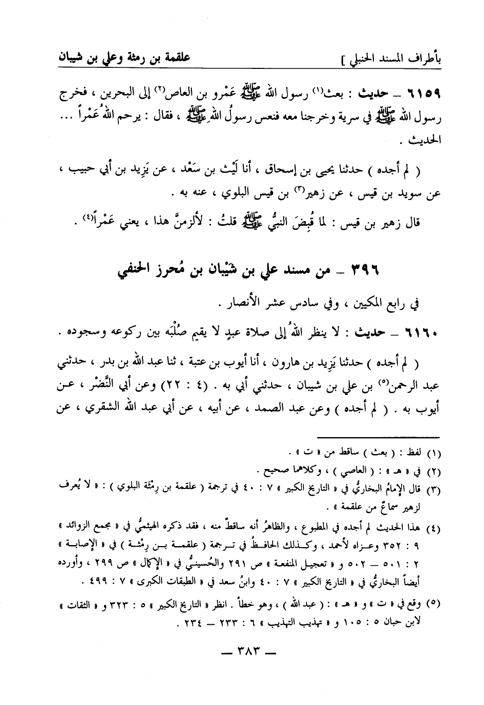 6159 - حديث: بعث رسول الله صَلَّى اللَّهُ عَلَيْهِ وَسَلَّمَ عمرو بن العاص إلى البحرين فخرج رسول الله صَلَّى اللَّهُ عَلَيْهِ وَسَلَّمَ في سرية وخرجنا معه فنعس رسول الله صَلَّى اللَّهُ عَلَيْهِ وَسَلَّمَ فقال يرحم الله عمرا..... الحديث (لم أجده) حدثنا يحيى بن إسحاق أنا ليث بن سعد، عن يزيد بن أبي حبيب عن سويد بن قيس، عن زهير بن قيس البلوي عنه به. قال زهير بن قيس لما قبض النبي صَلَّى اللَّهُ عَلَيْهِ وَسَلَّمَ قلت لألزمن هذا يعني عمرا