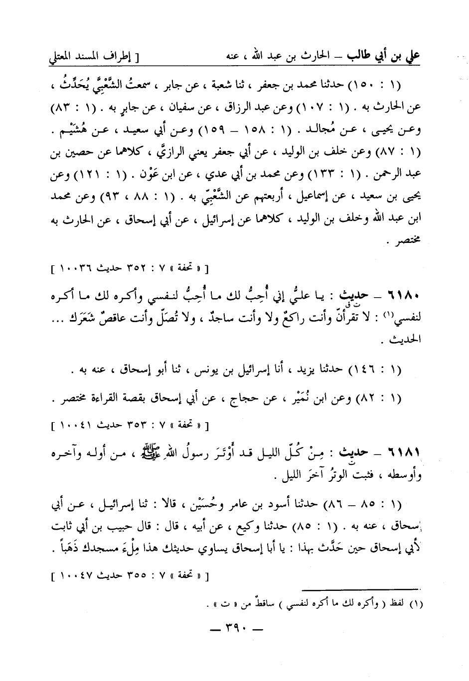 6180 -[ت ق] حديث: يا علي إني أحب لك ما أحب لنفسي وأكره لك ما أكره لنفسي لا تقرأن وأنت راكع ولا وأنت ساجد ولا تصل وأنت عاقص شعرك ... . الحديث (1: 146) حدثنا يزيد أنا إسرائيل بن يونس، ثنا أبو إسحاق عنه به. (1: 82) وعن ابن نمير، عن حجاج، عن أبي إسحاق بقصة القراءة مختصر