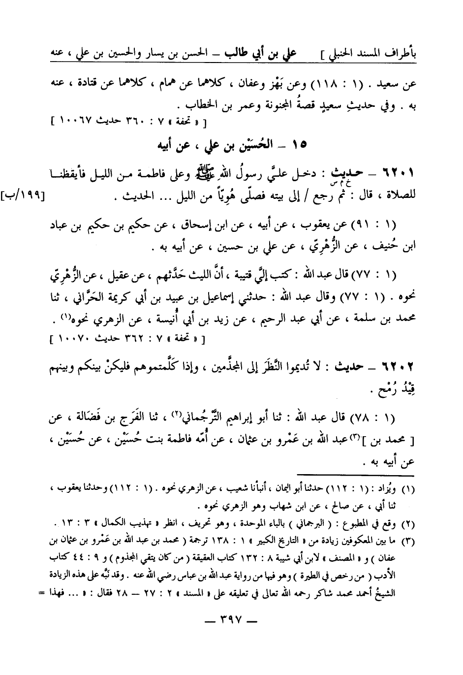 6201 -[خ م س] حديث دخل علي رسول الله صَلَّى اللَّهُ عَلَيْهِ وَسَلَّمَ وعلى فاطمة من الليل فأيقظنا للصلاة قال ثم رجع / إلى بيته فصلى هويا من الليل ... الحديث. (1: 91) عن يعقوب، عن أبيه، عن ابن إسحاق، عن حكيم بن حكيم بن عباد بن حنيف، عن الزهري، عن علي بن حسين، عن أبيه به. (1: 77) قال عبد الله كتب إلي قتيبة أن الليث حدثهم، عن عقيل، عن الزهري نحوه (1: 77) وقال عبد الله: حدثني إسماعيل بن عبيد بن أبي كريمة الحراني، ثنا محمد بن سلمة، عن أبي عبد الرحيم، عن زيد بن أبي أنيسة، عن الزهري نحوه.