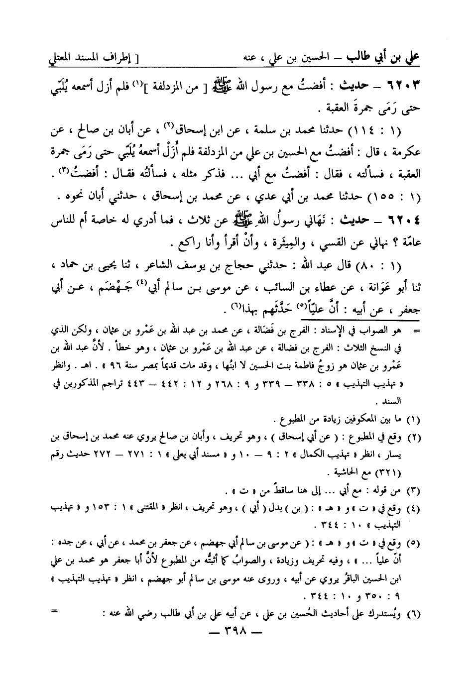 6203 - حديث: أفضت مع رسول الله صَلَّى اللَّهُ عَلَيْهِ وَسَلَّمَ [من المزدلفة] فلم أزل أسمعه يلبي حتى رمى جمرة العقبة (1: 114) حدثنا محمد بن سلمة، عن ابن إسحاق، عن أبان بن صالح، عن عكرمة قال أفضت مع الحسين بن علي من المزدلفة فلم أزل أسمعه يلبي حتى رمى جمرة العقبة فسألته فقال أفضت مع أبي. . فذكر مثله فسألته فقال أفضت (1: 155) حدثنا محمد بن أبي عدي، عن محمد بن إسحاق، حدثني أبان نحوه.
