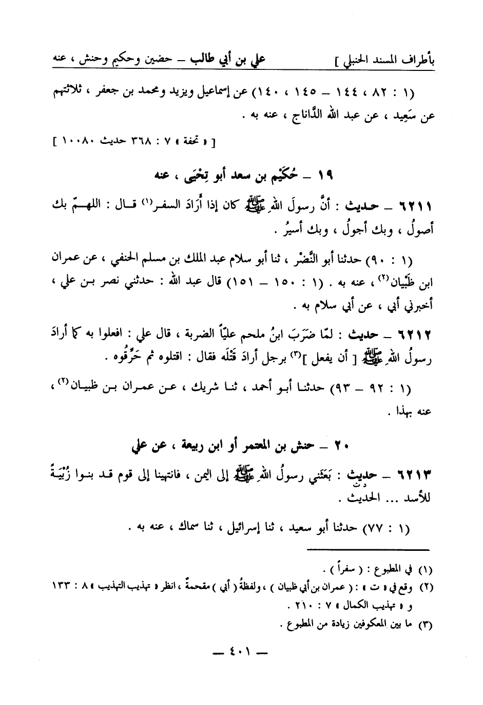 6211 - حديث أن رسول الله صَلَّى اللَّهُ عَلَيْهِ وَسَلَّمَ كان إذا أراد السفر قال اللهم بك أصول وبك أجول وبك أسير (1: 90) حدثنا أبو النضر، ثنا أبو سلام عبد الملك بن مسلم الحنفي، عن عمران بن ظبيان عنه به. (1: 150 - 151) قال عبد الله: حدثني نصر بن علي، أخبرني أبي، عن أبي سلام به