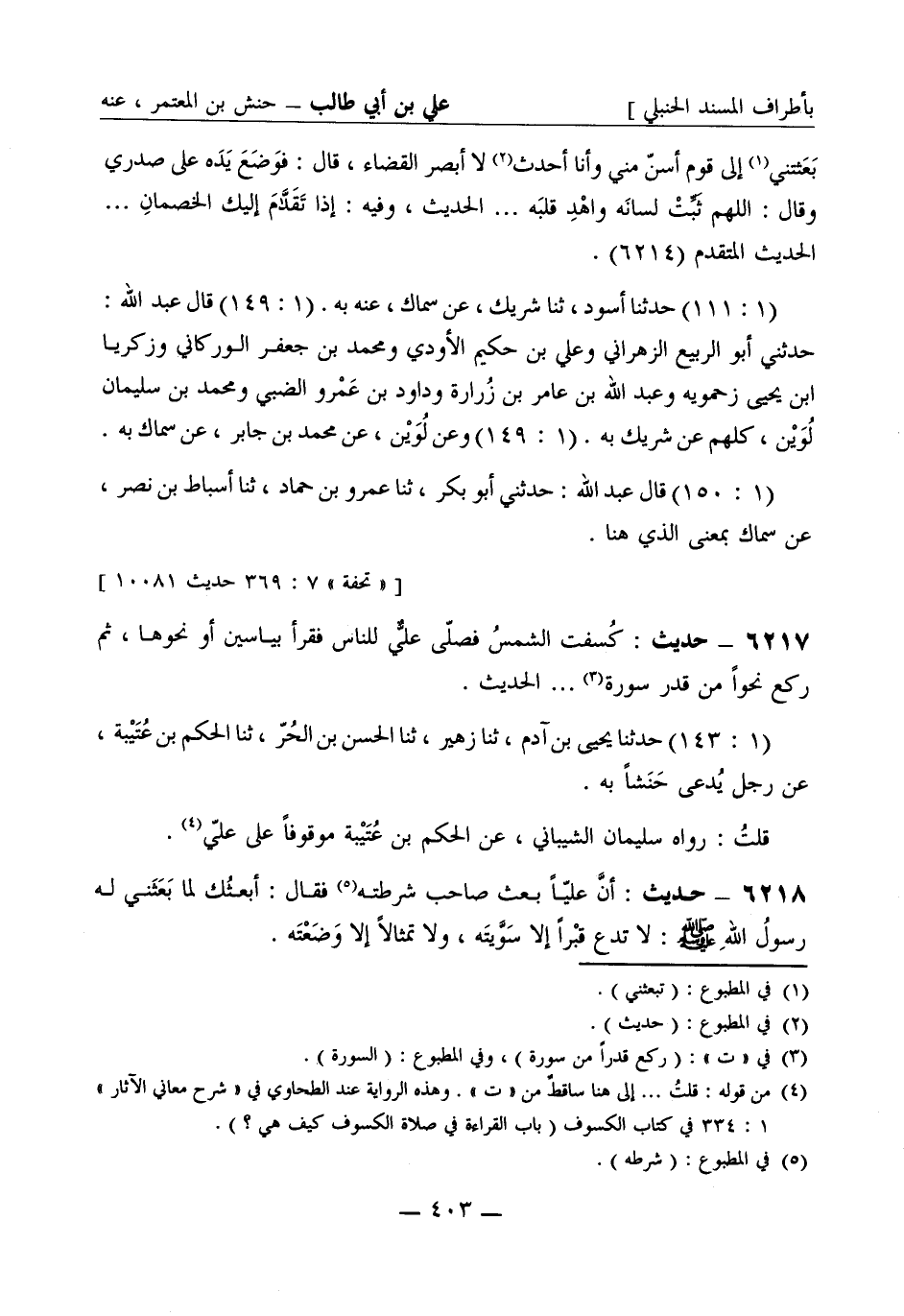 6217 - حديث كسفت الشمس فصلى علي للناس فقرأ بياسين أو نحوها ثم ركع نحوا من قدر سورة ... الحديث (1: 143) حدثنا يحيى بن آدم، ثنا زهير، ثنا الحسن بن الحر، ثنا الحكم بن عتيبة، عن رجل يدعى حنشا به قلت رواه سليمان الشيباني، عن الحكم بن عتيبة موقوفا على علي