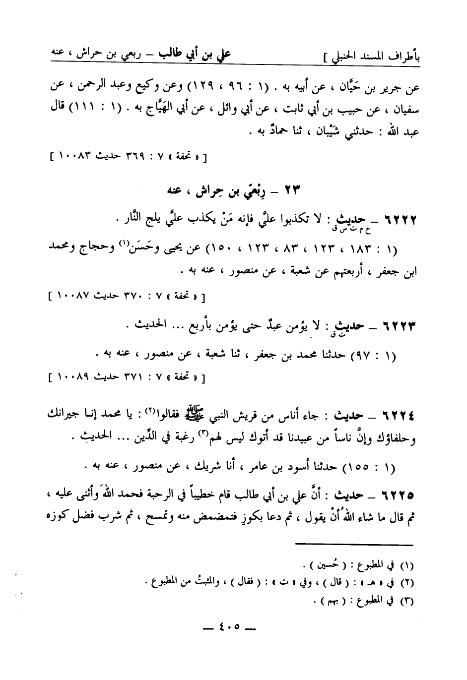 6222 -[خ م ت س ق] حديث لا تكذبوا علي فإنه من يكذب علي يلج النار (1: 183، 123، 83، 123، 150) عن يحيى وحسن وحجاج ومحمد بن جعفر أربعتهم، عن شعبة، عن منصور عنه به.