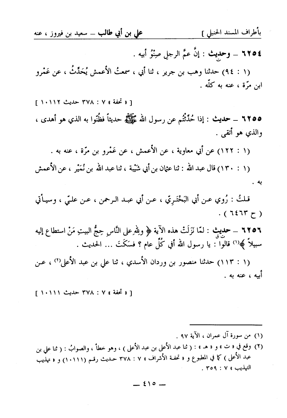 6255 - حديث: إذا حدثتم عن رسول الله صَلَّى اللَّهُ عَلَيْهِ وَسَلَّمَ حديثا فظنوا به الذي هو أهدى والذي هو أتقى (1: 122) عن أبي معاوية، عن الأعمش، عن عمرو بن مرة عنه به. (1: 130) قال عبد الله: ثنا عثمان بن أبي شيبة، ثنا عبد الله بن نمير، عن الأعمش به قلت روي عن أبي البختري، عن أبي عبد الرحمن، عن علي وسيأتي (ح 6463)