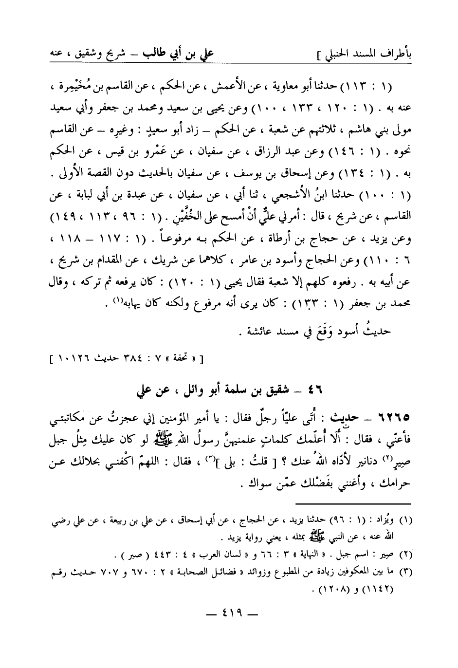 6265 -[ت] حديث: أتى عليا رجل فقال يا أمير المؤمنين إني عجزت عن مكاتبتي فأعني فقال ألا أعلمك كلمات علمنيهن رسول الله صَلَّى اللَّهُ عَلَيْهِ وَسَلَّمَ لو كان عليك مثل جبل صير دنانير لأداه الله عنك [قلت بلى] فقال اللهم اكفني بحلالك عن حرامك وأغنني بفضلك عمن سواك -[420]- (1: 153) قال عبد الله: حدثني أبو عبد الرحمن عبد الله بن عمر، ثنا أبو معاوية، عن عبد الرحمن بن إسحاق، عن سيار أبي الحكم، عنه بهذا.