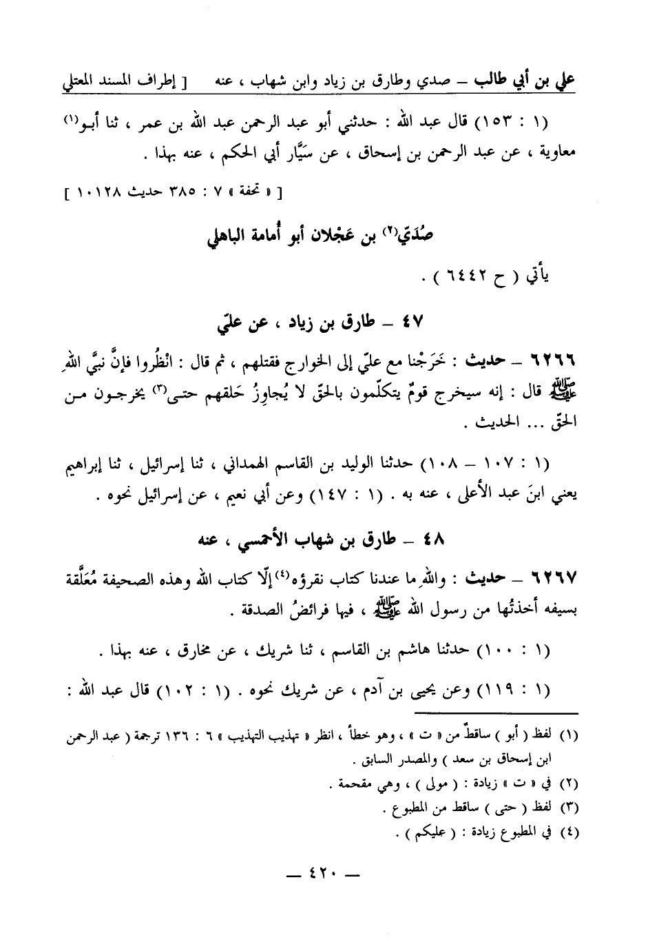 6266 - حديث: خرجنا مع علي إلى الخوارج فقتلهم ثم قال انظروا فإن نبي الله صَلَّى اللَّهُ عَلَيْهِ وَسَلَّمَ قال إنه سيخرج قوم يتكلمون بالحق لا يجاوز حلقهم حتى يخرجون من الحق ... الحديث. (1: 107 - 108) حدثنا الوليد بن القاسم الهمداني، ثنا إسرائيل، ثنا إبراهيم يعني ابن عبد الأعلى عنه به. (1: 147) وعن أبي نعيم، عن إسرائيل نحوه.