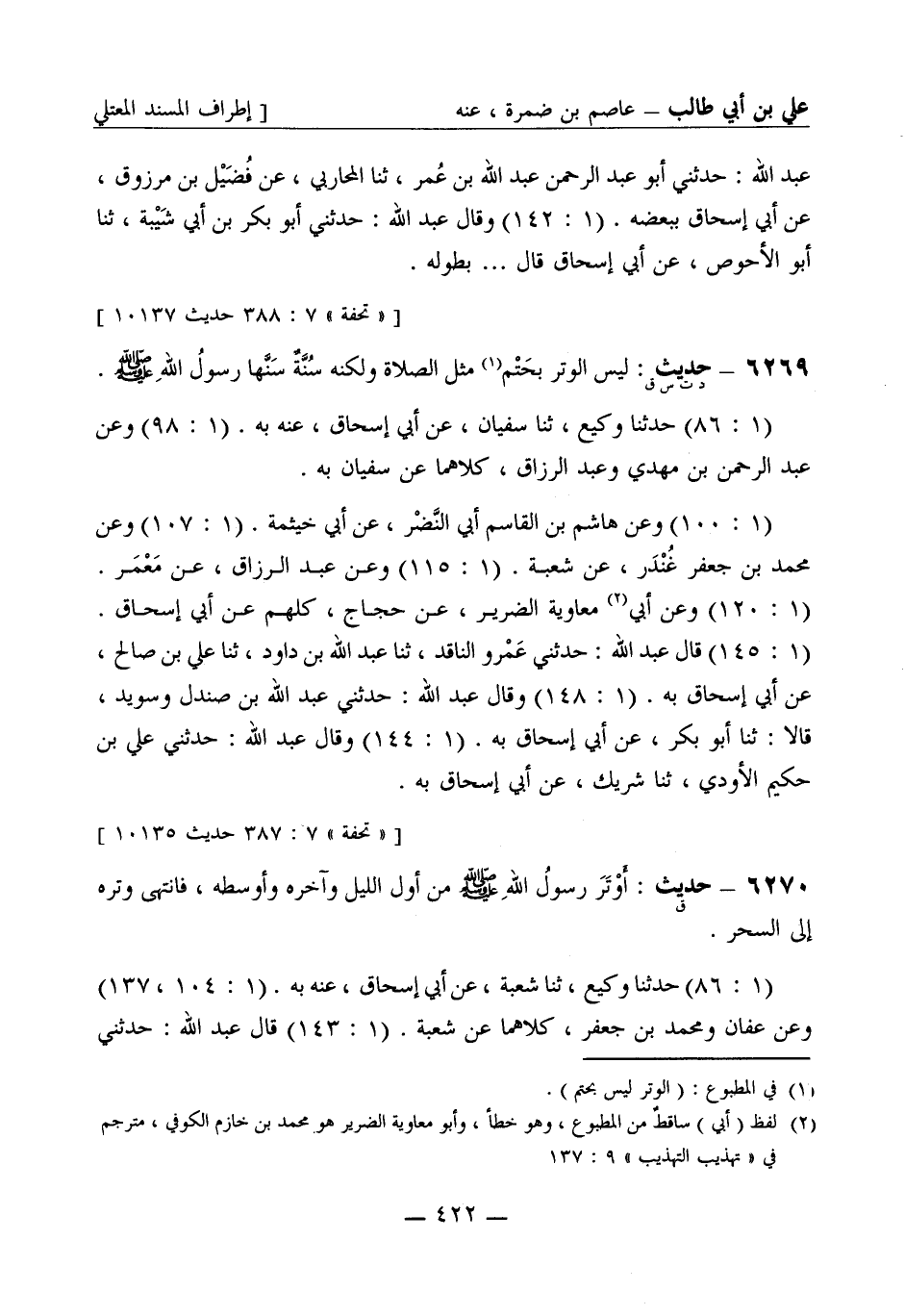 6269 -[د ت س ق] حديث: ليس الوتر بحتم مثل الصلاة ولكنه سنة سنها رسول الله صَلَّى اللَّهُ عَلَيْهِ وَسَلَّمَ (1: 86) حدثنا وكيع، ثنا سفيان، عن أبي إسحاق عنه به. (1: 98) وعن عبد الرحمن بن مهدي وعبد الرزاق، كلاهما عن سفيان به (1: 100) وعن هاشم بن القاسم أبي النضر، عن أبي خيثمة (1: 107) وعن محمد بن جعفر غندر، عن شعبة (1: 115) وعن عبد الرزاق، عن معمر (1: 120) وعن أبي معاوية الضرير، عن حجاج كلهم، عن أبي إسحاق (1: 145) قال عبد الله: حدثني عمرو الناقد، ثنا عبد الله بن داود، ثنا علي بن صالح عن أبي إسحاق به (1: 148) وقال عبد الله: حدثني عبد الله بن صندل وسويد قالا: ثنا أبو بكر، عن أبي إسحاق به (1: 144) وقال عبد الله: حدثني علي بن حكيم الأودي، ثنا شريك، عن أبي إسحاق به