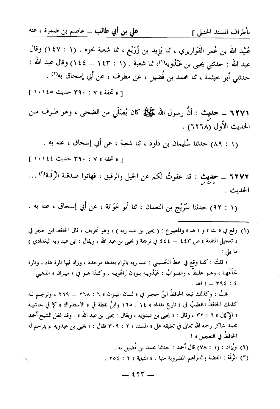 6272 -[د ت س] حديث قد عفوت لكم عن الخيل والرقيق فهاتوا صدقة الرقة ... . الحديث (1: 92) حدثنا سريج بن النعمان، ثنا أبو عوانة، عن أبي إسحاق عنه به -[424]-. (1: 113 - 114) وعن ابن نمير يعني عبد الله، عن الأعمش، عن أبي إسحاق به (1: 145) قال عبد الله: حدثني العباس بن الوليد النرسي، ثنا أبو عوانة به (1: 148) وقال عبد الله: حدثني أحمد بن محمد بن أيوب، ثنا أبو بكر بن عياش عن الأعمش به (1: 148) وقال عبد الله: حدثني محمد بن إشكاب، ثنا محمد بن أبي عبيدة، حدثني أبي، عن الأعمش به