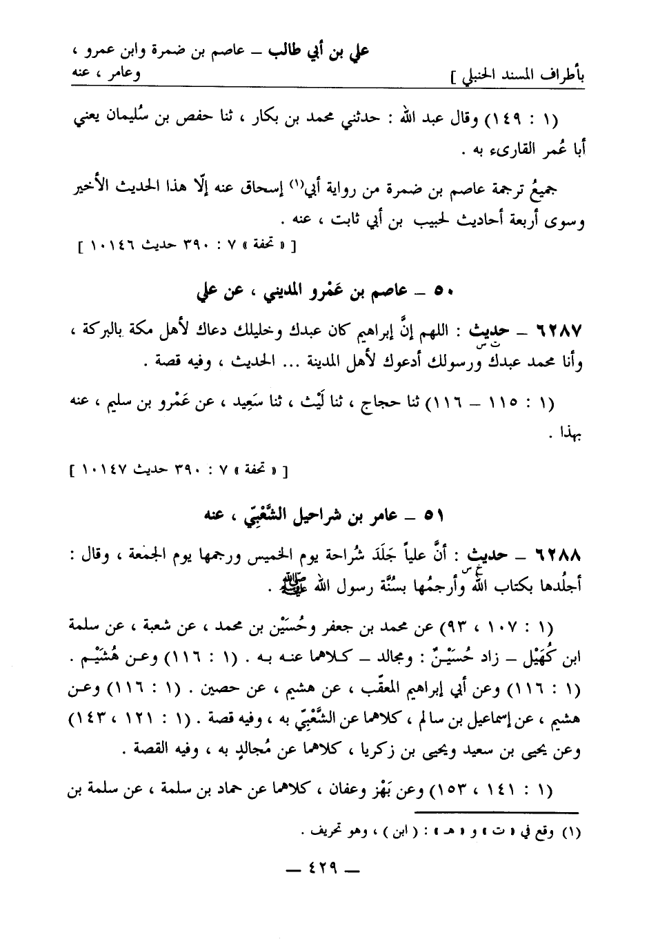 6288 -[خ س] حديث: أن عليا جلد شراحة يوم الخميس ورجمها يوم الجمعة وقال أجلدها بكتاب الله وأرجمها بسنة رسول الله صَلَّى اللَّهُ عَلَيْهِ وَسَلَّمَ (1: 107، 93) عن محمد بن جعفر وحسين بن محمد، عن شعبة، عن سلمة بن كهيل زاد حسين ومجالد كلاهما عنه به. (1: 116) وعن هشيم (1: 116) وعن أبي إبراهيم المعقب، عن هشيم، عن حصين (1: 116) وعن هشيم، عن إسماعيل بن سالم، كلاهما عن الشعبي به وفيه قصة (1: 121، 143) وعن يحيى بن سعيد ويحيى بن زكريا، كلاهما عن مجالد به وفيه قصة -[430]- (1: 141، 153) وعن بهز وعفان، كلاهما عن حماد بن سلمة، عن سلمة بن كهيل به (1: 140) وعن محمد بن جعفر، عن سعيد، عن قتادة، عن الشعبي بمعناه