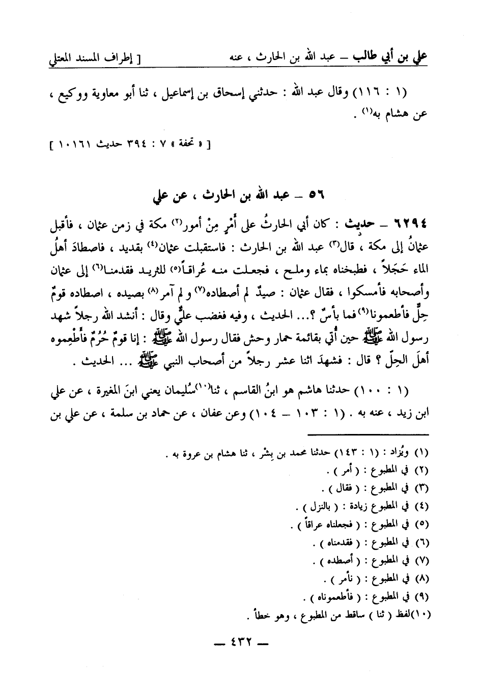 6294 -[د] حديث: كان أبي الحارث على أمر من أمور مكة في زمن عثمان فأقبل عثمان إلى مكة قال عبد الله بن الحارث فاستقبلت عثمان بقديد فاصطاد أهل الماء حجلا فطبخناه بماء وملح فجعلت منه عراقا للثريد فقدمنا إلى عثمان وأصحابه فأمسكوا فقال عثمان صيد لم أصطاده ولم آمر بصيده اصطاده قوم حل فأطعمونا فما بأس ... الحديث. وفيه فغضب علي وقال أنشد الله رجلا شهد رسول الله صَلَّى اللَّهُ عَلَيْهِ وَسَلَّمَ حين أتي بقائمة حمار وحش فقال رسول الله صَلَّى اللَّهُ عَلَيْهِ وَسَلَّمَ إنا قوم حرم فأطعموه أهل الحل قال فشهد اثنا عشر رجلا من أصحاب النبي صَلَّى اللَّهُ عَلَيْهِ وَسَلَّمَ ... . الحديث. (1: 100) حدثنا هاشم هو ابن القاسم، ثنا سليمان يعني ابن المغيرة، عن علي بن زيد عنه به. (1: 103 - 104) وعن عفان، عن حماد بن سلمة، عن علي بن -[433]- زيد نحوه. (1: 100) قال عبد الله: ثنا هدبة بن خالد، ثنا همام، ثنا علي بن زيد به