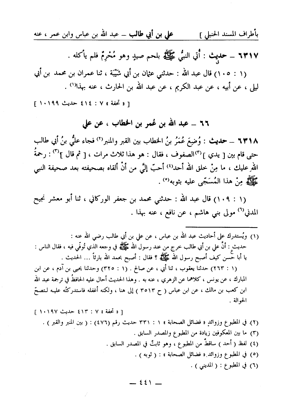 6318 - حديث: وضع عمر بن الخطاب بين القبر والمنبر فجاء علي بن أبي طالب حتى قام بين [يدي] الصفوف فقال هو هذا ثلاث مرات [ثم قال] رحمة الله عليك ما من خلق الله أحد أحب إلي من أن ألقاه بصحيفته بعد صحيفة النبي صَلَّى اللَّهُ عَلَيْهِ وَسَلَّمَ من هذا المسجى عليه بثوبه (1: 109) قال عبد الله: حدثني محمد بن جعفر الوركاني، ثنا أبو معشر نجيح المدني مولى بني هاشم، عن نافع، عنه بهذا.