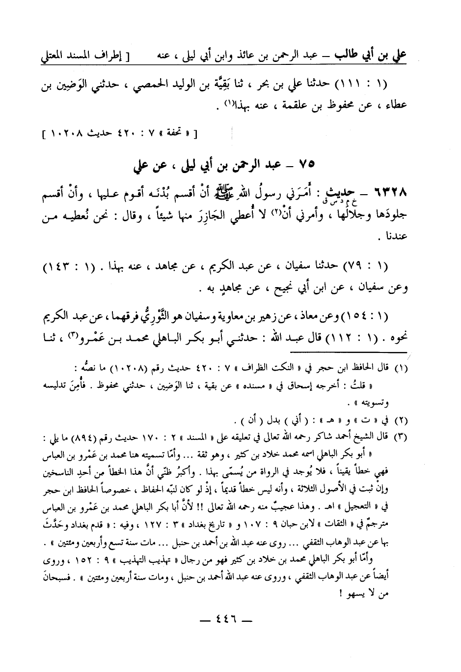 6328 -[خ م د س ق] حديث أمرني رسول الله صَلَّى اللَّهُ عَلَيْهِ وَسَلَّمَ أن أقسم بدنه أقوم عليها وأن أقسم جلودها وجلالها وأمرني أن لا أعطي الجازر منها شيئا وقال نحن نعطيه من عندنا (1: 79) حدثنا سفيان، عن عبد الكريم، عن مجاهد، عنه بهذا. (1: 143) وعن سفيان، عن ابن أبي نجيح، عن مجاهد به (1: 154) وعن معاذ، عن زهير بن معاوية وسفيان هو الثوري فرقهما، عن عبد الكريم نحوه (1: 112) قال عبد الله: حدثني أبو بكر الباهلي محمد بن عمرو، ثنا -[447]- عبد الوهاب الثقفي، ثنا أيوب، ثنا عبد الكريم وابن أبي نجيح، عن مجاهد به (1: 112) وقال: حدثني سويد بن سعيد، ثنا يحيى بن زكريا، عن ابن جريج، عن الحسن بن مسلم، عن مجاهد به مختصر (1: 123) قال أحمد: ثنا يحيى، ثنا ابن جريج به (1: 123) وثنا عبد الرزاق، ثنا معمر، عن عبد الكريم (1: 132) وعن وكيع، عن سيف بن سليمان، عن مجاهد به