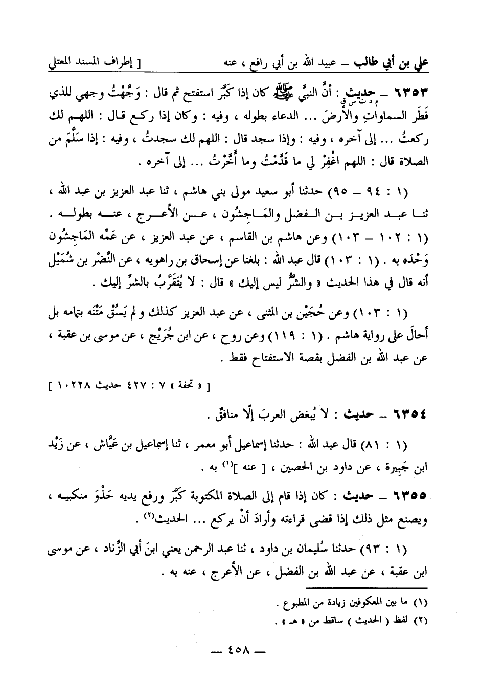 6353 -[م د ت س ق] حديث أن النبي صَلَّى اللَّهُ عَلَيْهِ وَسَلَّمَ كان إذا كبر استفتح ثم قال وجهت وجهي للذي فطر السماوات والأرض ... . الدعاء بطوله وفيه وكان إذا ركع قال اللهم لك ركعت ... إلى آخره وفيه وإذا سجد قال اللهم لك سجدت وفيه إذا سلم من الصلاة قال اللهم اغفر لي ما قدمت وما أخرت ... . إلى آخره (1: 94 - 95) حدثنا أبو سعيد مولى بني هاشم، ثنا عبد العزيز بن عبد الله، ثنا عبد العزيز بن الفضل والماجشون، عن الأعرج عنه بطوله (1: 102 - 103) وعن هاشم بن القاسم، عن عبد العزيز، عن عمه الماجشون وحده به (1: 103) قال عبد الله: بلغنا عن إسحاق بن راهويه، عن النضر بن شميل أنه قال في هذا الحديث والشر ليس إليك قال لا يتقرب بالشر إليك (1: 103) وعن حجين بن المثنى، عن عبد العزيز كذلك ولم يسق متنه بتمامه بل أحال على رواية هاشم (1: 119) وعن روح، عن ابن جريج، عن موسى بن عقبة، عن عبد الله بن الفضل بقصة الاستفتاح فقط