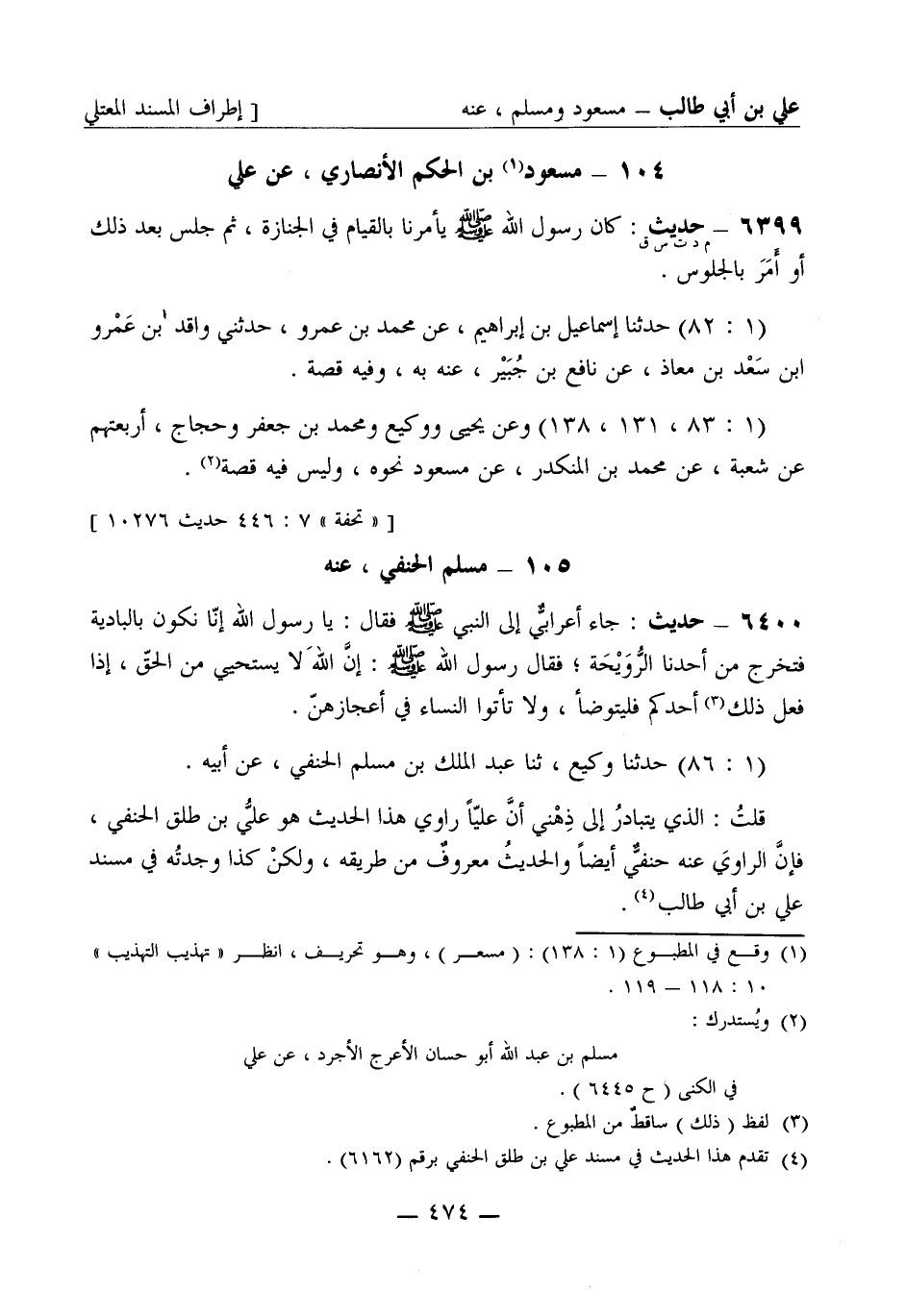 6400 - حديث جاء أعرابي إلى النبي صَلَّى اللَّهُ عَلَيْهِ وَسَلَّمَ فقال يا رسول الله إنا نكون بالبادية فتخرج من أحدنا الرويحة فقال رسول الله صَلَّى اللَّهُ عَلَيْهِ وَسَلَّمَ إن الله لا يستحيي من الحق إذا فعل ذلك أحدكم فليتوضأ ولا تأتوا النساء في أعجازهن (1: 86) حدثنا وكيع، ثنا عبد الملك بن مسلم الحنفي، عن أبيه قلت الذي يتبادر إلى ذهني أن عليا راوي هذا الحديث هو علي بن طلق الحنفي فإن الراوي عنه حنفي أيضا والحديث معروف من طريقه ولكن كذا وجدته في مسند علي بن أبي طالب