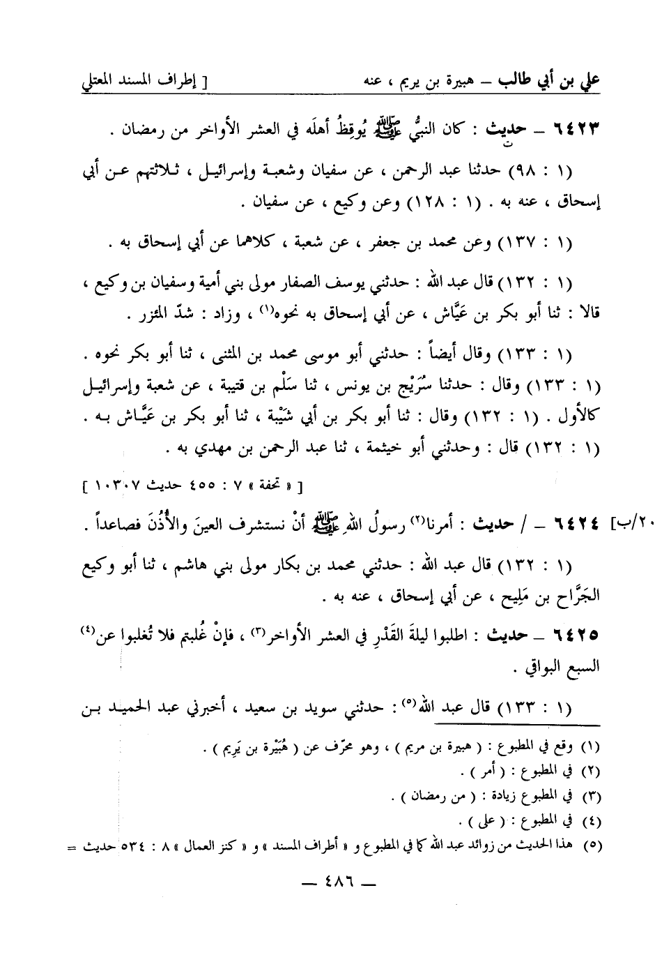 6423 -[ت] حديث كان النبي صَلَّى اللَّهُ عَلَيْهِ وَسَلَّمَ يوقظ أهله في العشر الأواخر من رمضان (1: 98) حدثنا عبد الرحمن، عن سفيان وشعبة وإسرائيل ثلاثتهم، عن أبي إسحاق عنه به. (1: 128) وعن وكيع، عن سفيان (1: 137) وعن محمد بن جعفر، عن شعبة، كلاهما عن أبي إسحاق به (1: 132) قال عبد الله: حدثني يوسف الصفار مولى بني أمية وسفيان بن وكيع قالا: ثنا أبو بكر بن عياش، عن أبي إسحاق به نحوه. وزاد شد المئزر (1: 133) وقال أيضا: حدثني أبو موسى محمد بن المثني، ثنا أبو بكر نحوه. (1: 133) وقال: حدثنا سريج بن يونس، ثنا سلم بن قتيبة، عن شعبة وإسرائيل كالأول (1: 132) وقال: ثنا أبو بكر بن أبي شيبة، ثنا أبو بكر بن عياش به (1: 132) قال وحدثني أبو خيثمة، ثنا عبد الرحمن بن مهدي به.