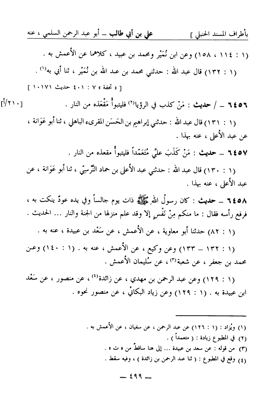 6457 - حديث من كذب علي متعمدا فليتبوأ مقعده من النار (1: 130) قال عبد الله: حدثني عبد الأعلى بن حماد النرسي، ثنا أبو عوانة، عن عبد الأعلى، عنه بهذا.