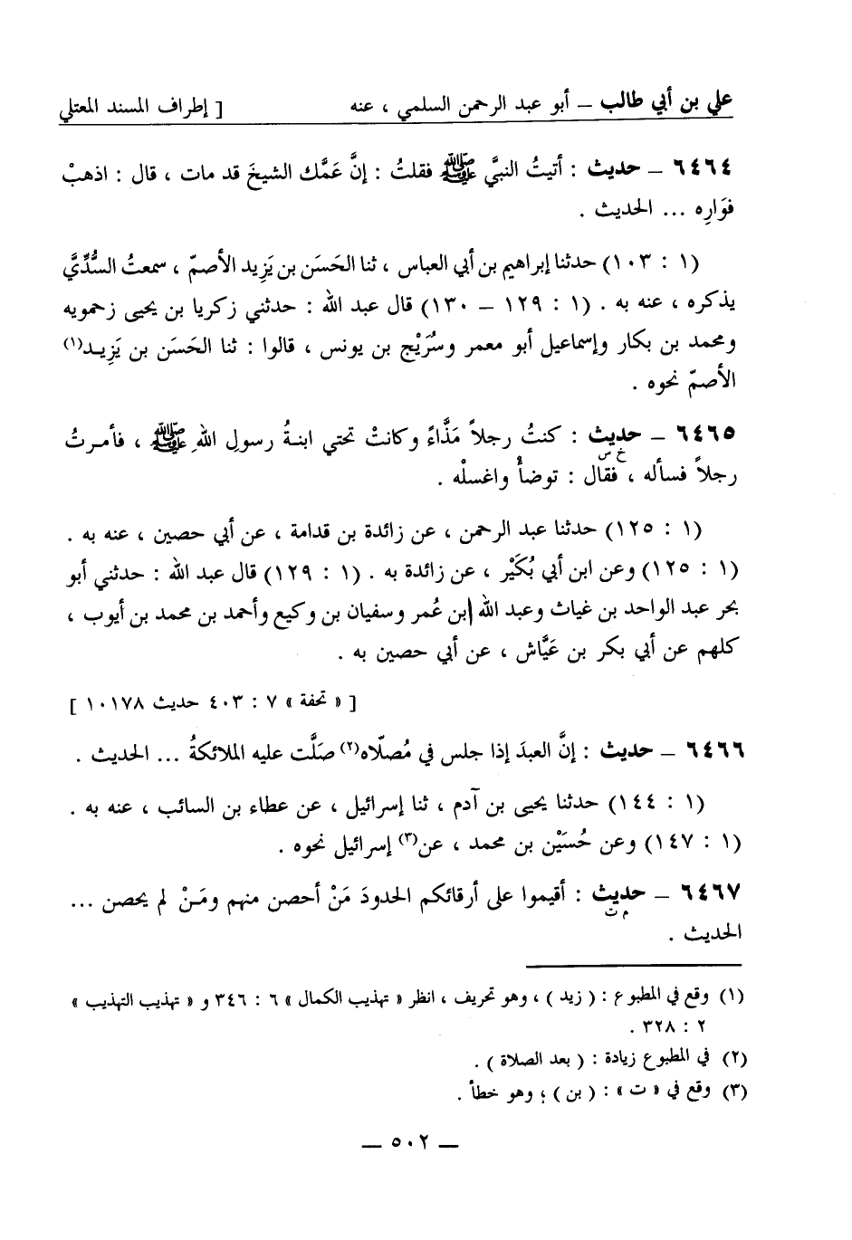 6465 -[خ س] حديث كنت رجلا مذاء وكانت تحتي ابنة رسول الله صَلَّى اللَّهُ عَلَيْهِ وَسَلَّمَ فأمرت رجلا فسأله فقال توضأ واغسله (1: 125) حدثنا عبد الرحمن، عن زائدة بن قدامة، عن أبي حصين عنه به. (1: 125) وعن ابن أبي بكير، عن زائدة به (1: 129) قال عبد الله: حدثني أبو بحر عبد الواحد بن غياث وعبد الله بن عمر وسفيان بن وكيع وأحمد بن محمد بن أيوب كلهم، عن أبي بكر بن عياش، عن أبي حصين به