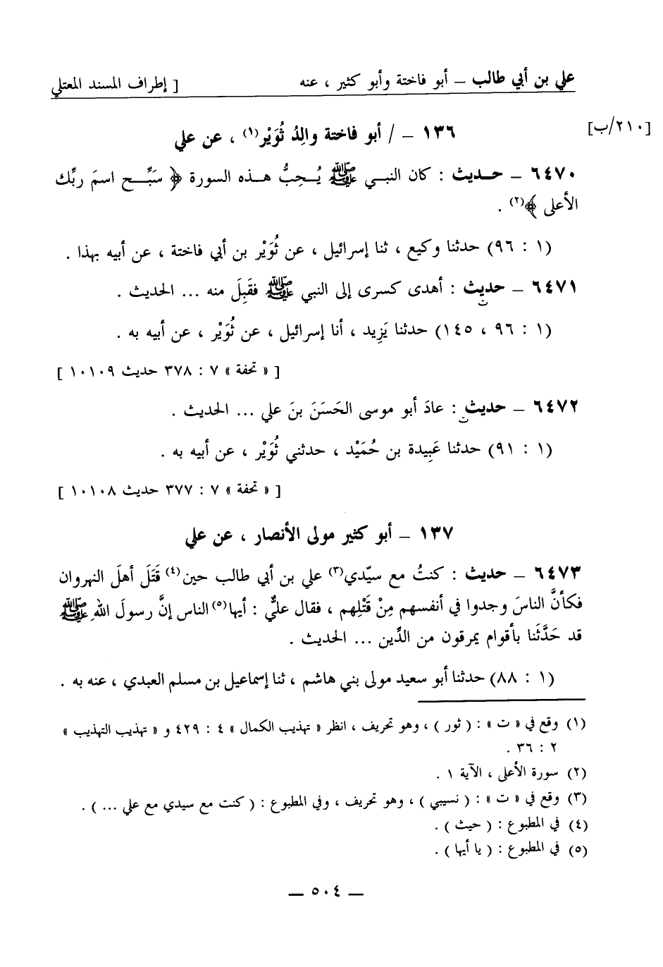 6472 -[ت] حديث عاد أبو موسى الحسن بن علي..... الحديث. (1: 91) حدثنا عبيدة بن حميد، حدثني ثوير، عن أبيه به.