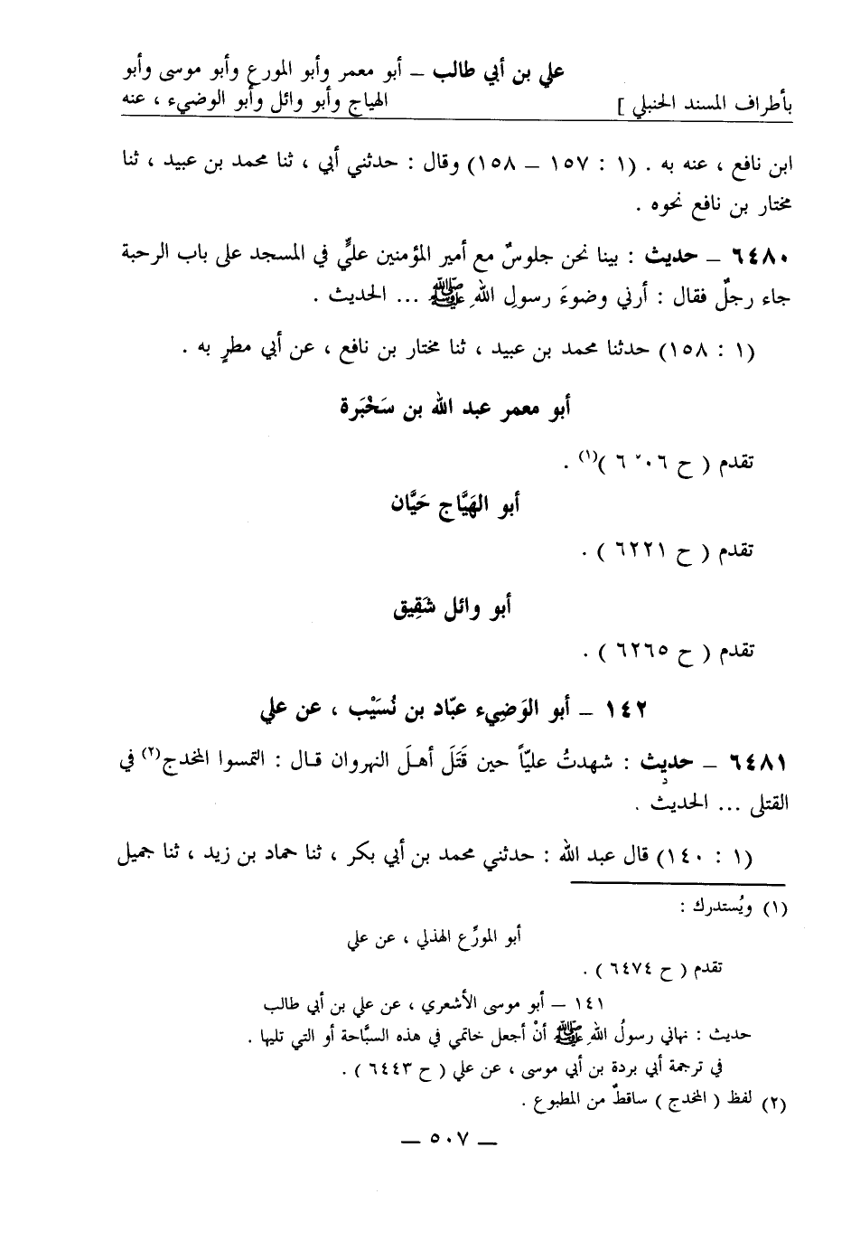 6481 -[د] حديث شهدت عليا حين قتل أهل النهروان قال التمسوا المخدج في القتلى ... . الحديث. (1: 140) قال عبد الله: حدثني محمد بن أبي بكر، ثنا حماد بن زيد، ثنا جميل -[508]- بن مرة عنه به. (1: 139) وقال: حدثني عبيد الله بن عمر القواريري، ثنا حماد بن زيد نحوه.