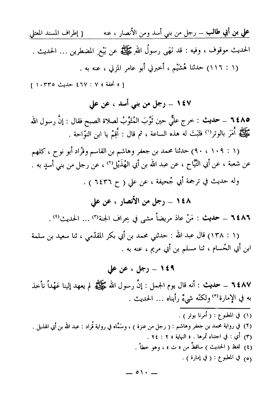 6485 - حديث خرج علي حين ثوب المثوب لصلاة الصبح فقال إن رسول الله صَلَّى اللَّهُ عَلَيْهِ وَسَلَّمَ أمر بالوتر فثبت له هذه الساعة ثم قال أقم يا ابن النواحة (1: 109، 90) حدثنا محمد بن جعفر وهاشم بن القاسم وقراد أبو نوح كلهم عن شعبة، عن أبي التياح، عن عبد الله بن أبي الهذيل، عن رجل من بني أسد به. وله حديث في ترجمة أبي جحيفة، عن علي (ح 6436)