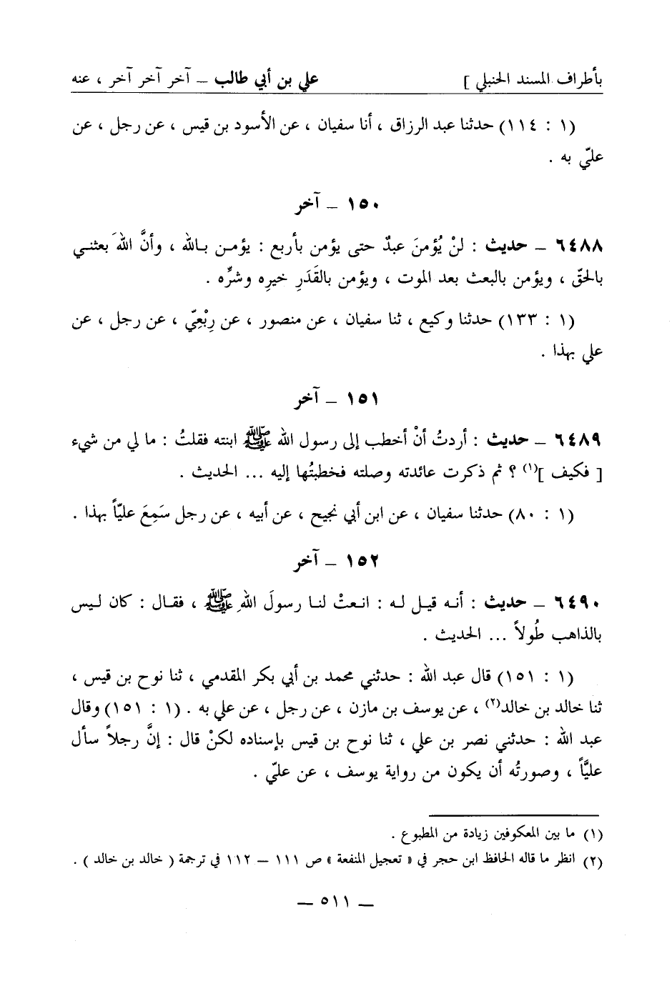 6490 - حديث أنه قيل له انعت لنا رسول الله صَلَّى اللَّهُ عَلَيْهِ وَسَلَّمَ فقال كان ليس بالذاهب طولا ... . الحديث. (1: 151) قال عبد الله: حدثني محمد بن أبي بكر المقدمي، ثنا نوح بن قيس، ثنا خالد بن خالد، عن يوسف بن مازن، عن رجل، عن علي به (1: 151) وقال عبد الله: حدثني نصر بن علي، ثنا نوح بن قيس بإسناده لكن قال إن رجلا سأل عليا وصورته أن يكون من رواية يوسف، عن علي