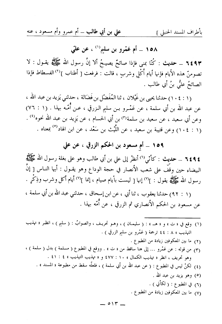 6493 - حديث كنا بمنى فإذا صائح يصيح ألا إن رسول الله صَلَّى اللَّهُ عَلَيْهِ وَسَلَّمَ يقول لا تصومن هذه الأيام فإنها أيام أكل وشرب قالت فرفعت [أطناب] الفسطاط فإذا الصائح علي بن أبي طالب (1: 104) حدثنا يحيى بن غيلان، ثنا المفضل بن فضالة، حدثني يزيد بن عبد الله، عن عبد الله بن أبي سلمة، عن عمرو بن سليم الزرقي، عن أمه بهذا (1: 76) وعن أبي سعيد، عن سعيد بن سلمة بن أبي الحسام، عن يزيد بن عبد الله نحوه. (1: 104) وعن قتيبة بن سعيد، عن الليث بن سعد، عن ابن الهاد بمعناه