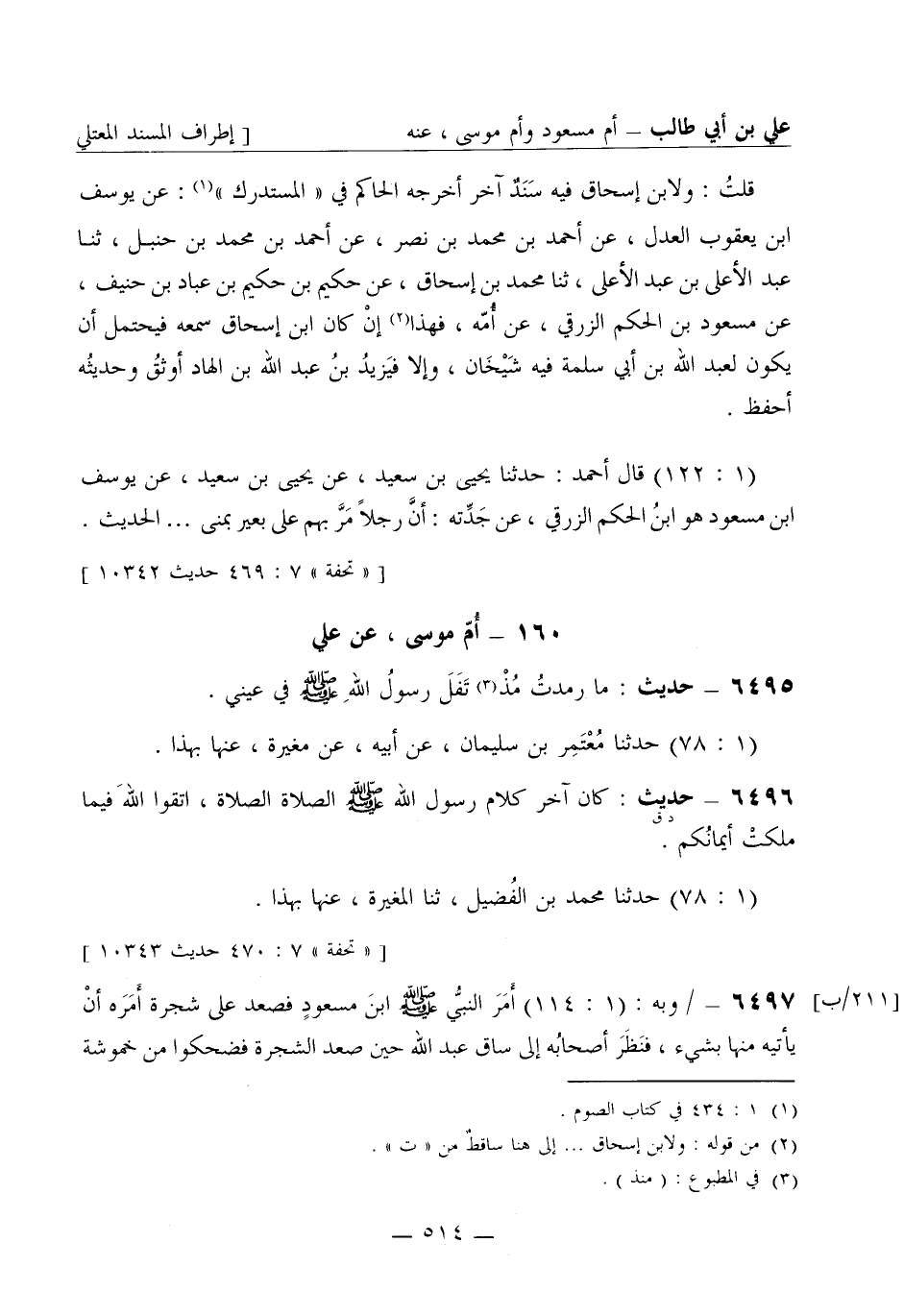 6495 - حديث ما رمدت مذ تفل رسول الله صَلَّى اللَّهُ عَلَيْهِ وَسَلَّمَ في عيني (1: 78) حدثنا معتمر بن سليمان، عن أبيه، عن مغيرة عنها بهذا