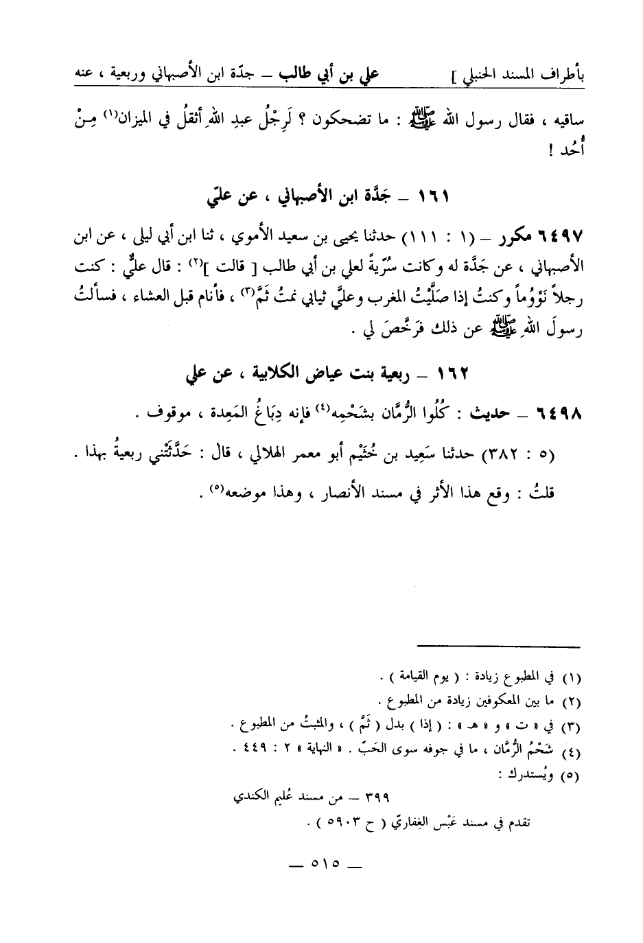 6497 - مكرر - (1: 111) حدثنا يحيى بن سعيد الأموي، ثنا ابن أبي ليلى، عن ابن الأصبهاني، عن جدة له وكانت سرية لعلي بن أبي طالب [قالت] قال علي كنت رجلا نؤوما وكنت إذا صليت المغرب وعلي ثيابي نمت ثم فأنام قبل العشاء فسألت رسول الله صَلَّى اللَّهُ عَلَيْهِ وَسَلَّمَ عن ذلك فرخص لي