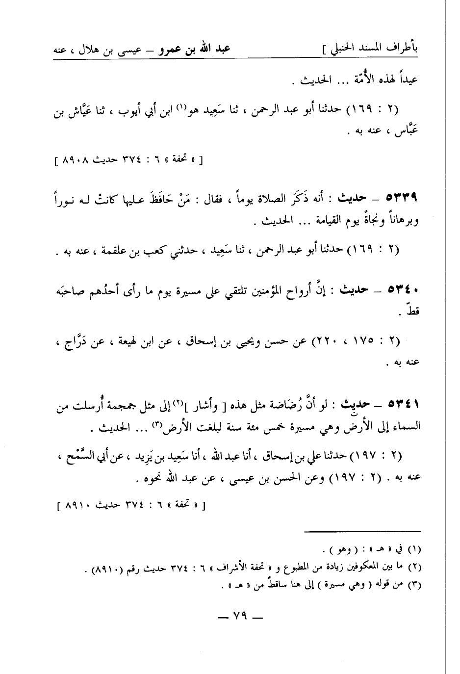 5339 - حديث أنه ذكر الصلاة يوما فقال من حافظ عليها كانت له نورا وبرهانا ونجاة يوم القيامة ... . الحديث. (2: 169) حدثنا أبو عبد الرحمن، ثنا سعيد، حدثني كعب بن علقمة عنه به.
