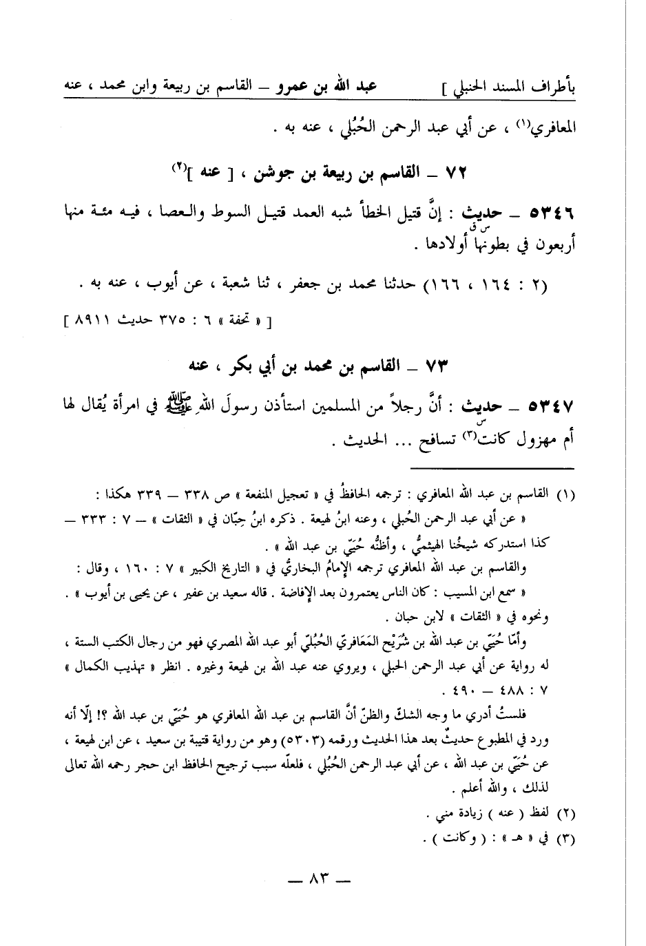 5347 -[س] حديث أن رجلا من المسلمين استأذن رسول الله صَلَّى اللَّهُ عَلَيْهِ وَسَلَّمَ في امرأة يقال لها أم مهزول كانت تسافح ... الحديث -[84]-. (2: 225) حدثنا عارم، ثنا معتمر بن سليمان قال قال أبي، ثنا الحضرمي عنه به. (2: 225) قال عبد الله: ثنا يحيى بن معين، ثنا المعتمر نحوه.
