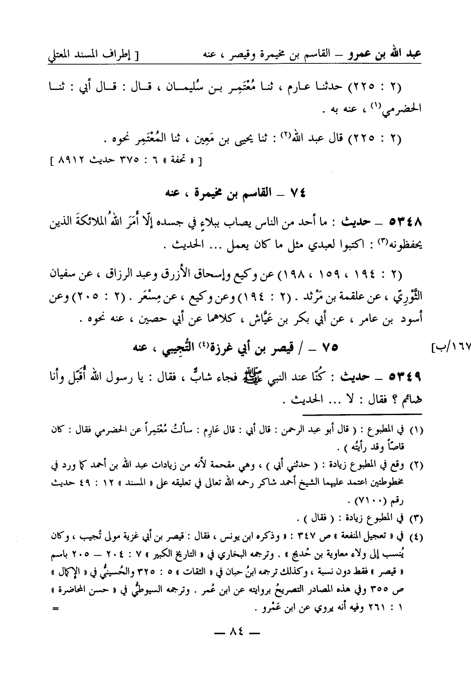 5348 - حديث ما أحد من الناس يصاب ببلاء في جسده إلا أمر الله الملائكة الذين يحفظونه اكتبوا لعبدي مثل ما كان يعمل ... . الحديث. (2: 194، 159، 198) عن وكيع وإسحاق الأزرق وعبد الرزاق، عن سفيان الثوري، عن علقمة بن مرثد (2: 194) وعن وكيع، عن مسعر (2: 205) وعن أسود بن عامر، عن أبي بكر بن عياش، كلاهما عن أبي حصين عنه نحوه.