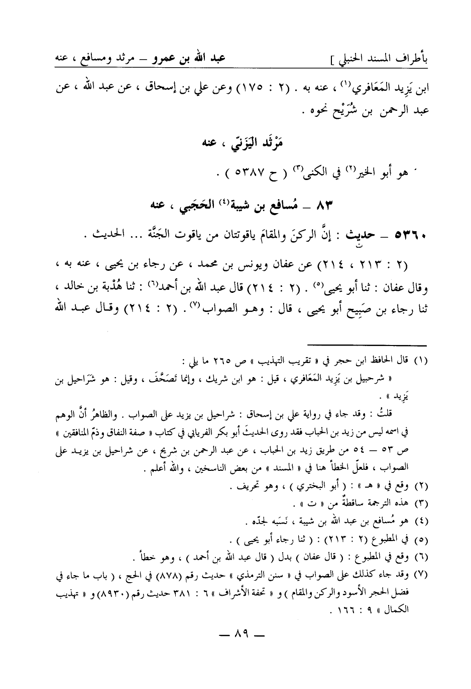 5360 -[ت] حديث إن الركن والمقام ياقوتتان من ياقوت الجنة ... . الحديث. (2: 213، 214) عن عفان ويونس بن محمد، عن رجاء بن يحيى عنه به. وقال عفان، ثنا أبو يحيى (2: 214) قال عبد الله بن أحمد، ثنا هدبة بن خالد، ثنا رجاء بن صبيح أبو يحيى قال: وهو الصواب (2: 214) وقال عبد الله -[90]- أيضا، ثنا عبيد الله بن عمر القواريري، ثنا يزيد بن زريع، ثنا رجاء أبو يحيى ... فذكر مثله
