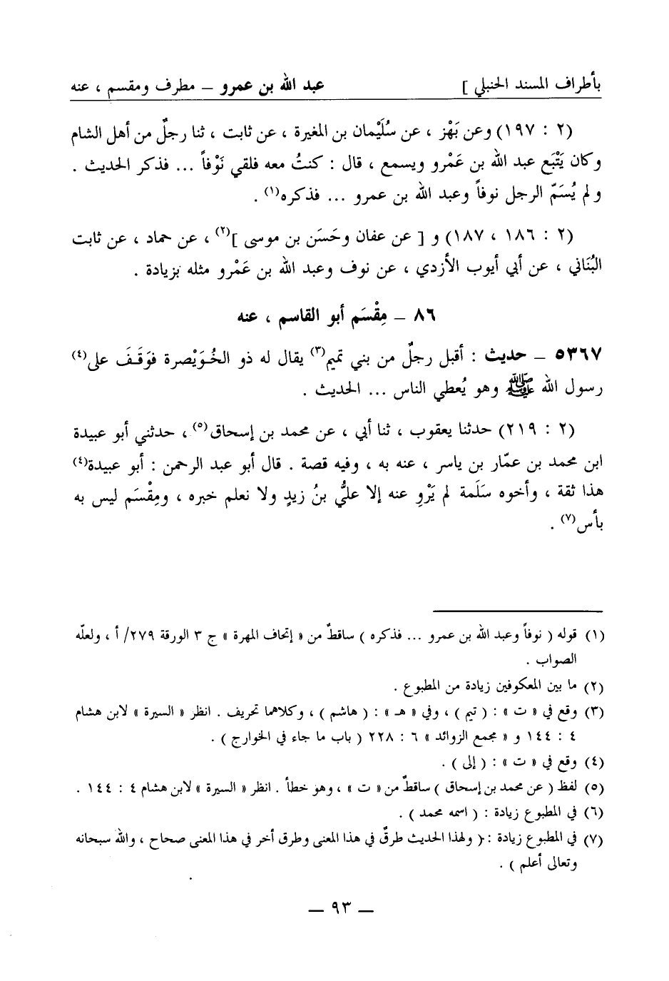 5367 - حديث أقبل رجل من بني تميم يقال له ذو الخويصرة فوقف على رسول الله صَلَّى اللَّهُ عَلَيْهِ وَسَلَّمَ وهو يعطي الناس ... الحديث. (2: 219) حدثنا يعقوب، ثنا أبي، عن محمد بن إسحاق، حدثني أبو عبيدة بن محمد بن عمار بن ياسر عنه به. وفيه قصة قال أبو عبد الرحمن: أبو عبيدة هذا ثقة وأخوه سلمة لم يرو عنه إلا علي بن زيد ولا نعلم خبره ومقسم ليس به بأس