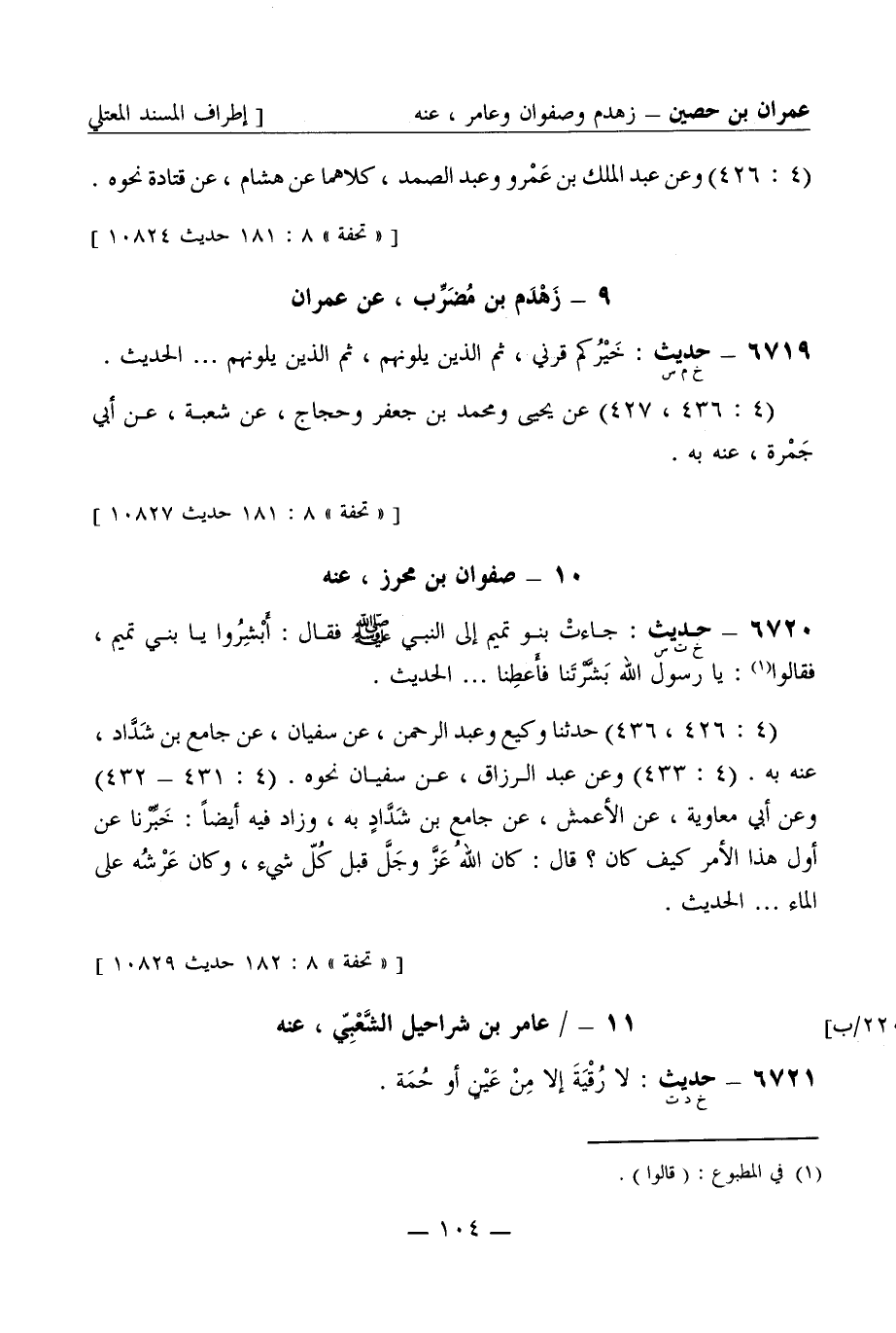 6720 -[خ ت س] حديث: جاءت بنو تميم إلى النبي صَلَّى اللَّهُ عَلَيْهِ وَسَلَّمَ فقال: أبشروا يا بني تميم، فقالوا: يا رسول الله بشرتنا فأعطنا ... الحديث. (4: 426، 436) حدثنا وكيع وعبد الرحمن، عن سفيان، عن جامع بن شداد، عنه به. (4: 433) وعن عبد الرزاق، عن سفيان نحوه. (4: 431 - 432) وعن أبي معاوية، عن الأعمش، عن جامع بن شداد به، وزاد فيه أيضا: خبرنا عن أول هذا الأمر كيف كان؟ قال: كان الله عز وجل قبل كل شيء، وكان عرشه على الماء ... . الحديث.