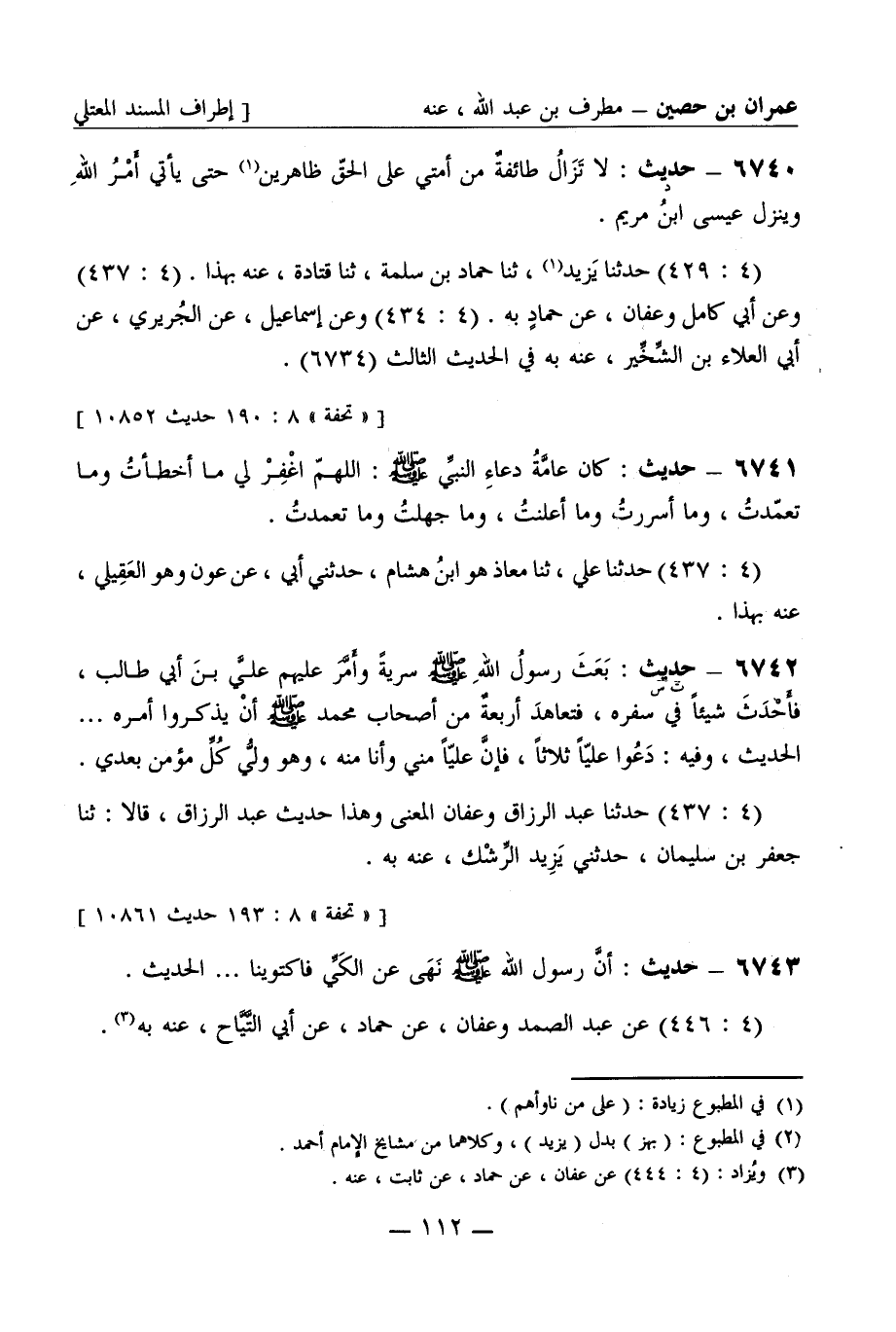 6740 -[د] حديث: لا تزال طائفة من أمتي على الحق ظاهرين حتى يأتي أمر الله وينزل عيسى ابن مريم. (4: 429) حدثنا يزيد، ثنا حماد بن سلمة، ثنا قتادة، عنه بهذا. (4: 437) وعن أبي كامل وعفان، عن حماد به. (4: 434) وعن إسماعيل، عن الجريري، عن أبي العلاء بن الشخير، عنه به في الحديث الثالث (6734)