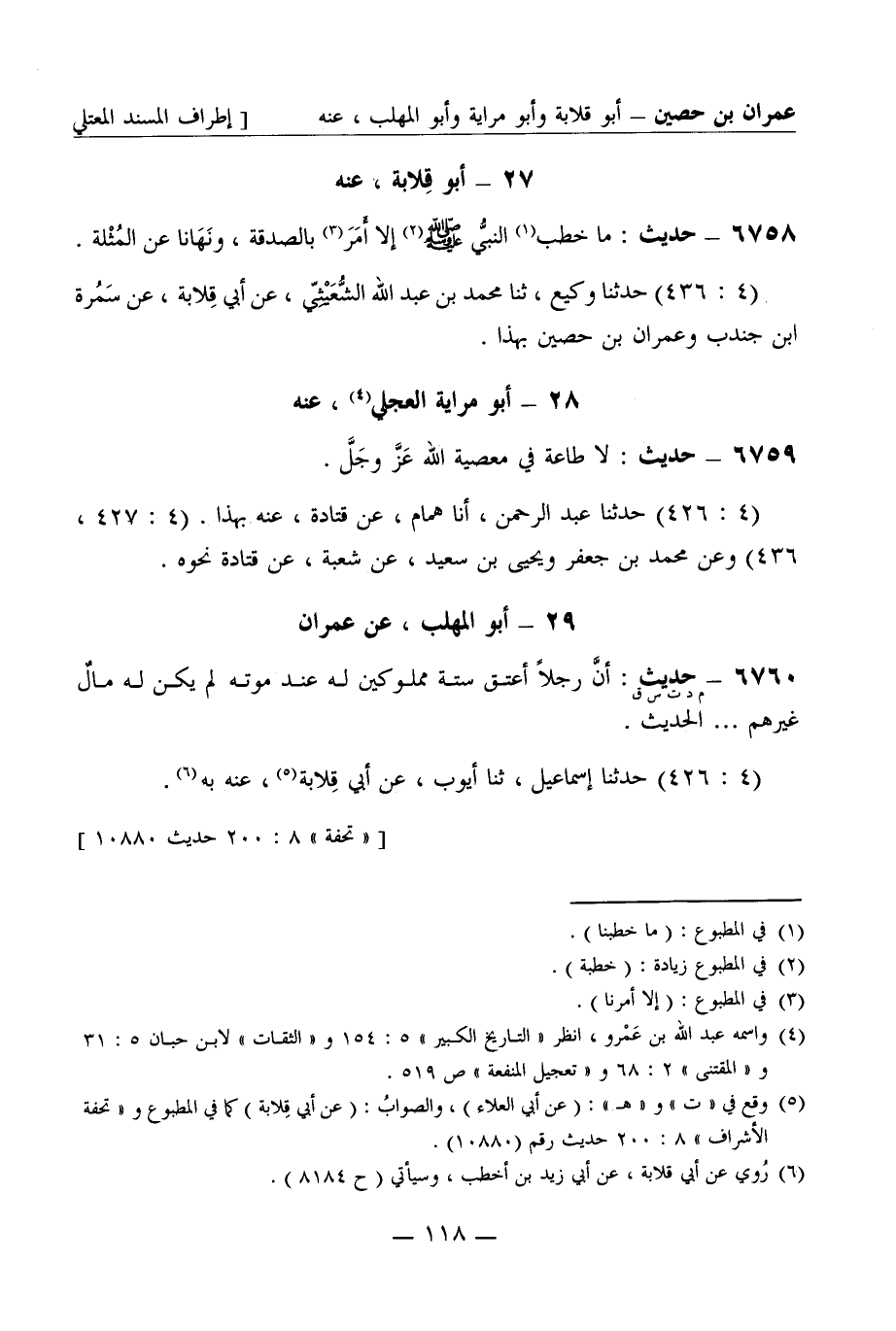 6760 -[م د ت س ق] حديث: أن رجلا أعتق ستة مملوكين له عند موته لم يكن له مال غيرهم ... الحديث. (4: 426) حدثنا إسماعيل، ثنا أيوب، عن أبي قلابة، عنه به.