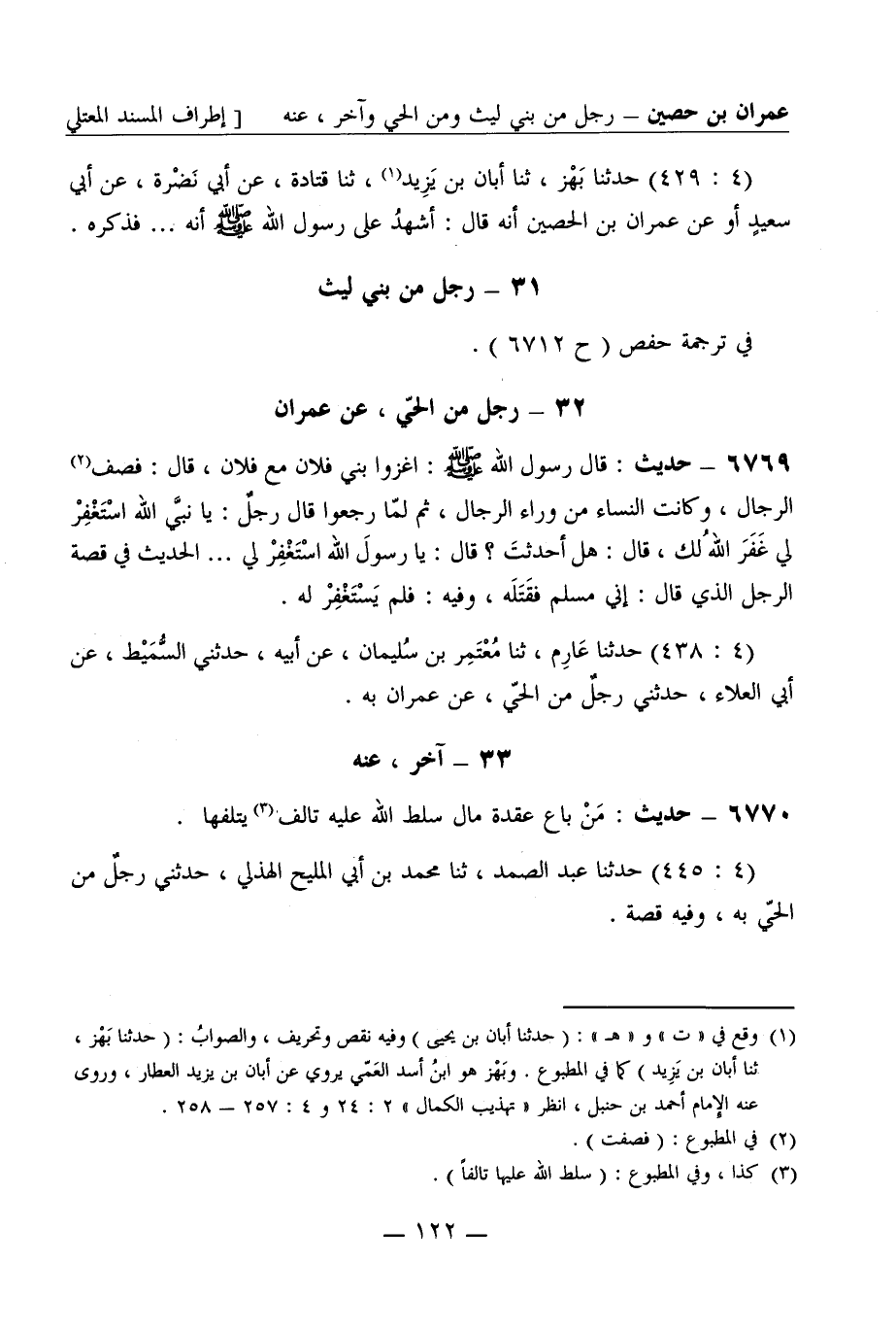 6769 - حديث: قال رسول الله صَلَّى اللَّهُ عَلَيْهِ وَسَلَّمَ: اغزوا بني فلان مع فلان، قال: فصف الرجال، وكانت النساء من وراء الرجال، ثم لما رجعوا قال رجل: يا نبي الله استغفر لي غفر الله لك، قال: هل أحدثت؟ قال: يا رسول الله استغفر لي ... الحديث في قصة الرجل الذي قال: إني مسلم فقتله، وفيه: فلم يستغفر له. (4: 438) حدثنا عارم، ثنا معتمر بن سليمان، عن أبيه، حدثني السميط، عن أبي العلاء، حدثني رجل من الحي، عن عمران به.