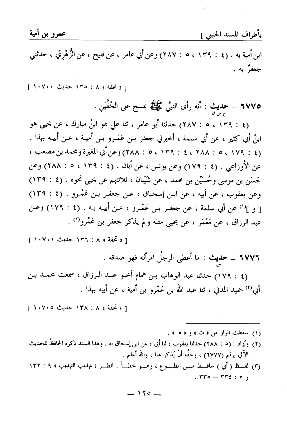 6775 -[خ س ق] حديث: أنه رأى النبي صَلَّى اللَّهُ عَلَيْهِ وَسَلَّمَ يمسح على الخفين. (4: 139، 5: 287) حدثنا أبو عامر، ثنا علي هو ابن مبارك، عن يحيى هو ابن أبي كثير، عن أبي سلمة، أخبرني جعفر بن عمرو بن أمية، عن أبيه بهذا. (4: 179، 5: 288، 4: 139، 5: 288) وعن أبي المغيرة ومحمد بن مصعب، عن الأوزاعي. (4: 179) وعن يونس، عن أبان. (4: 139، 5: 288) وعن حسن بن موسى وحسين بن محمد، عن شيبان، ثلاثتهم عن يحيى نحوه. (4: 139) وعن يعقوب، عن أبيه، عن ابن إسحاق، عن جعفر بن عمرو. (4: 139) [و] عن أبي سلمة، عن جعفر بن عمرو، عن أبيه به. (4: 179) وعن عبد الرزاق، عن معمر، عن يحيى مثله ولم يذكر جعفر بن عمرو.