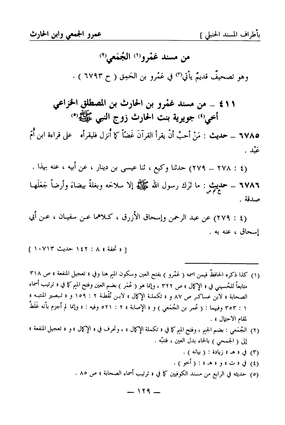 6786 -[خ تم س] حديث: ما ترك رسول الله صَلَّى اللَّهُ عَلَيْهِ وَسَلَّمَ إلا سلاحه وبغلة بيضاء وأرضا جعلها صدقة. (4: 279) عن عبد الرحمن وإسحاق الأزرق، كلاهما عن سفيان، عن أبي إسحاق، عنه به.